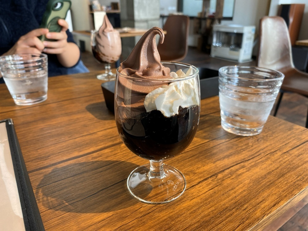 珈琲ゼリーは、とてもなめらかな食感。チョコレートソフトクリームは、カカオとミルクの風味が豊か。ほろ苦い珈琲ゼリーと甘いチョコレートソフトクリームの相性は最高です。