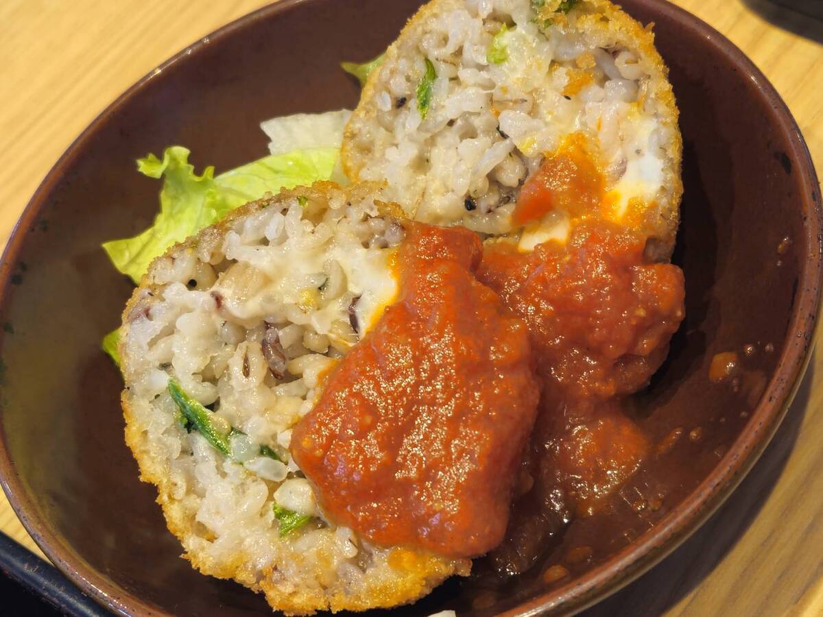 五穀ご飯とほうれん草、まろやかなチーズを包んだライスコロッケで大きさもなかなか。