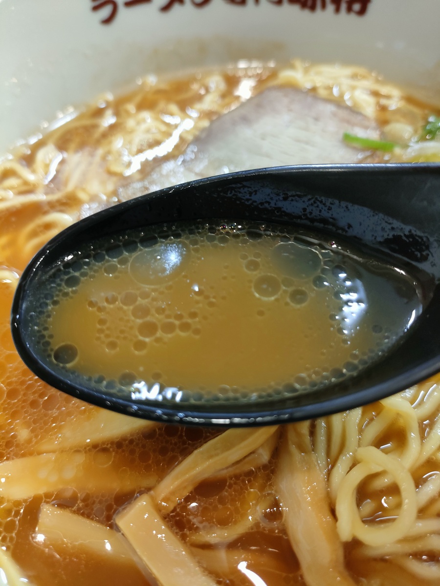 スープは豚骨ベースで、醤油の香りとコクがしっかりと味わえます。