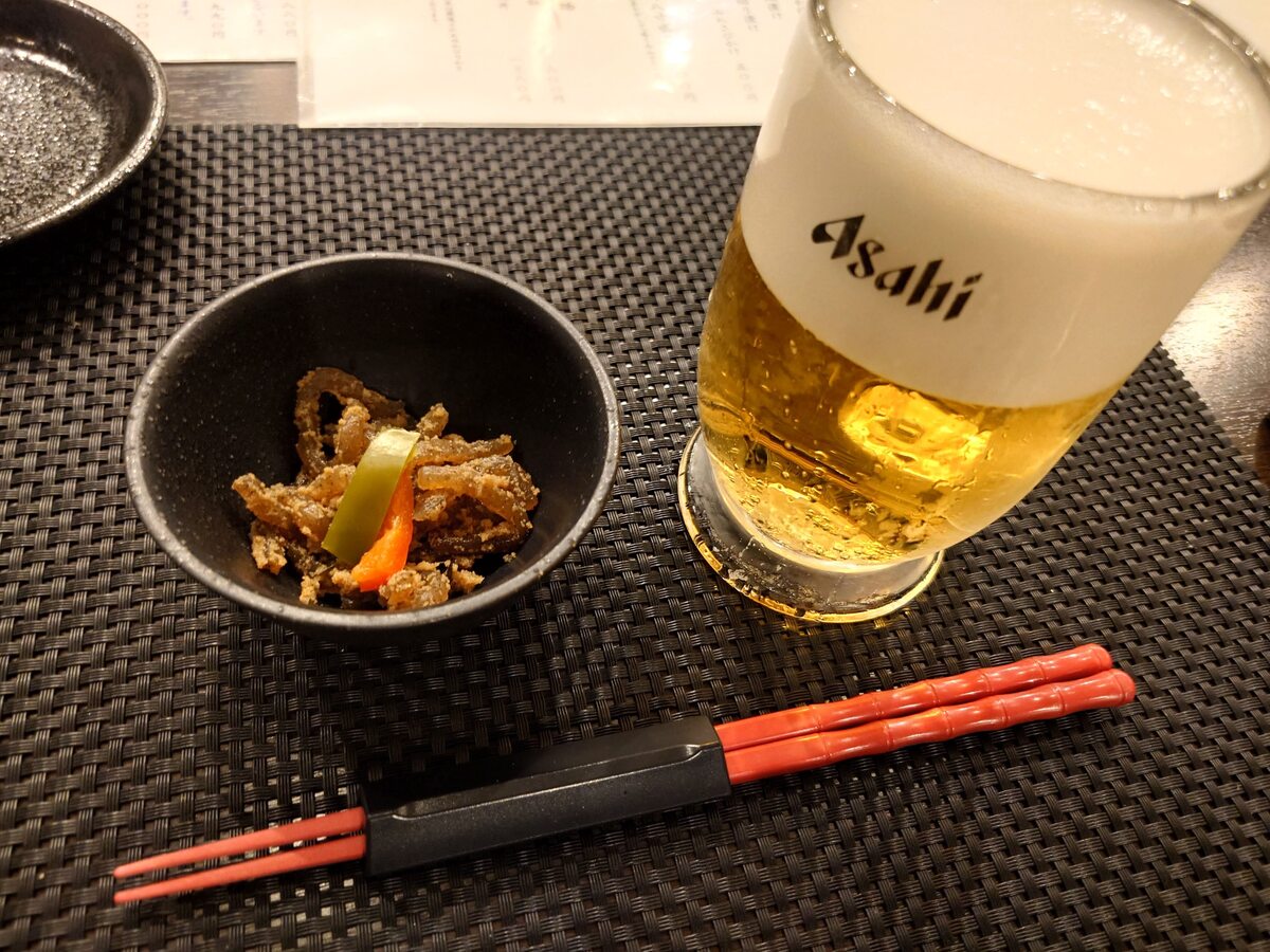 お通しと、アサヒスーパードライ。650円。