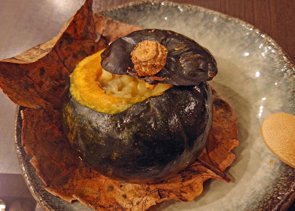 丸ごとの坊ちゃん南瓜が器代わりという、見た瞬間にテンションが上がる一皿。