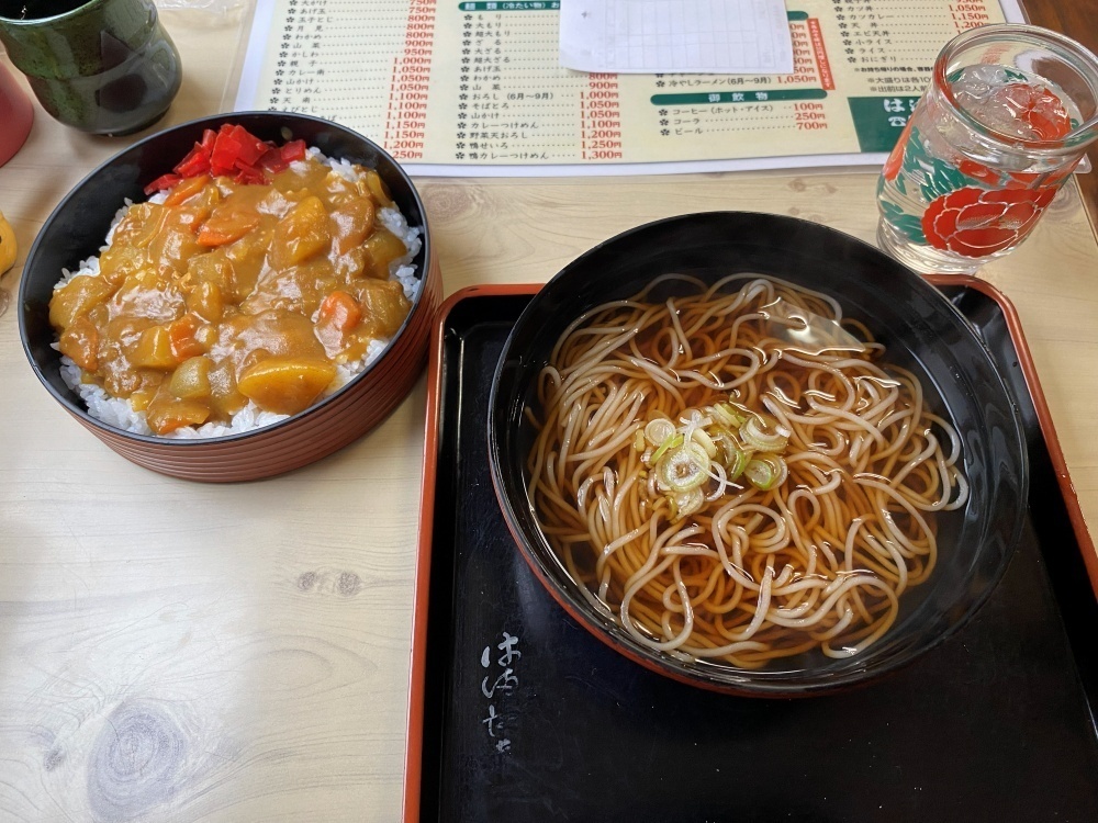 「は満長 末広店」の「カレーセット」は、2段重ねの器の下にそば、上にカレーライスが盛り付けられています。