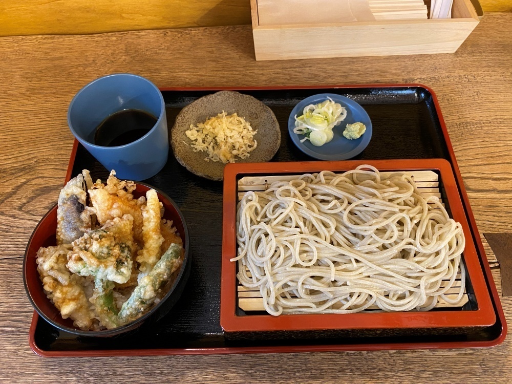 この日注文したのは「野菜天丼セット」。そばは「田舎そば」です。