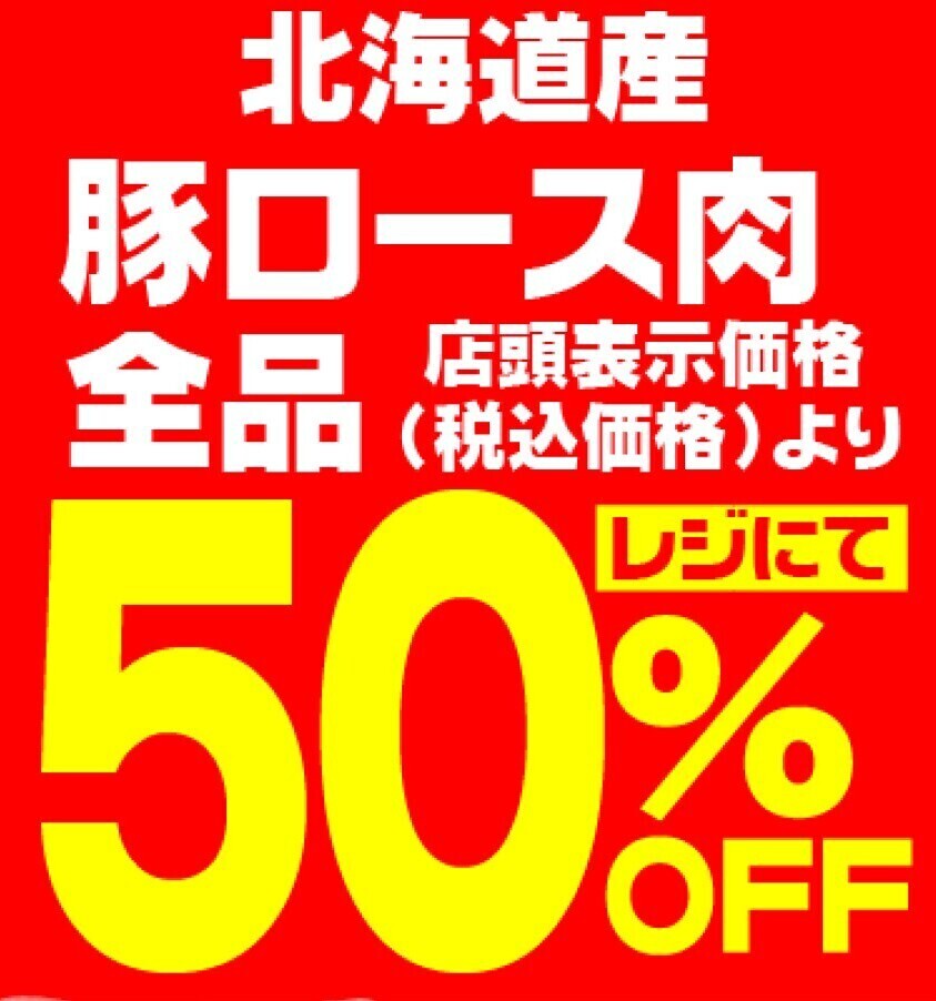 北海道産 豚ロース肉(全品レジにて50%オフ) 道内産の豚肉が半額です!!