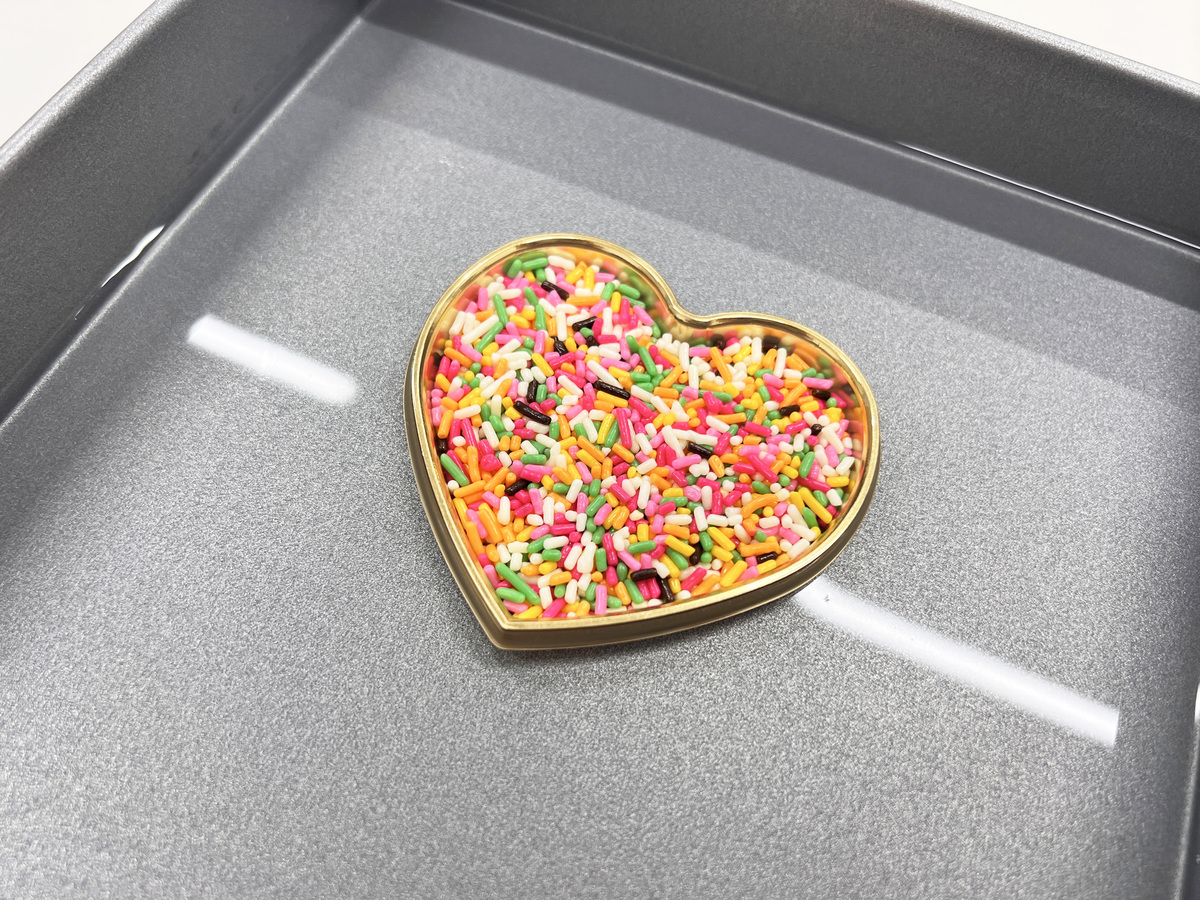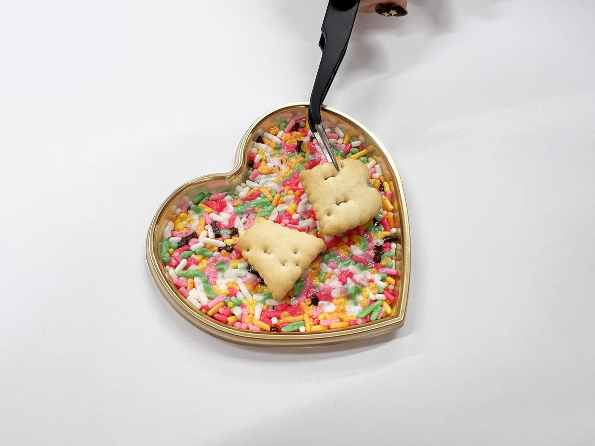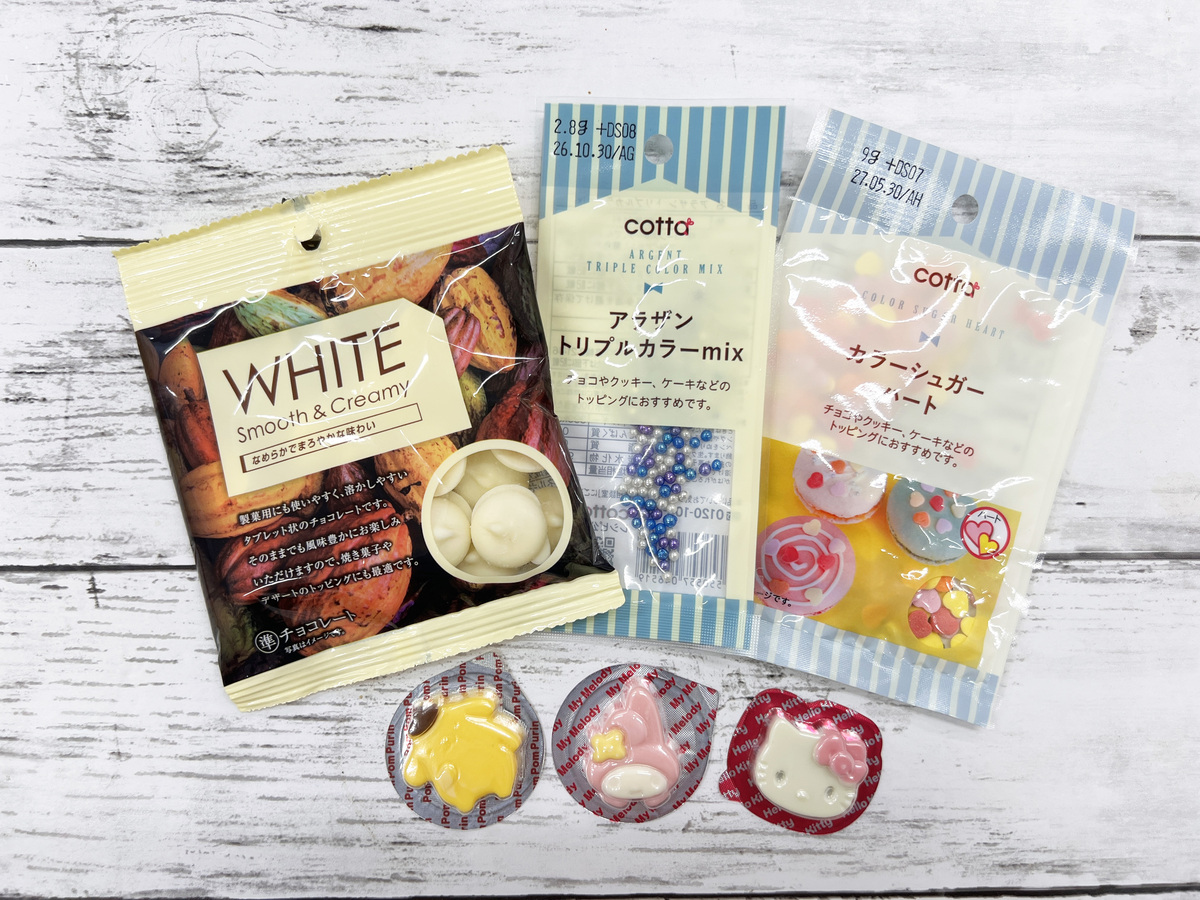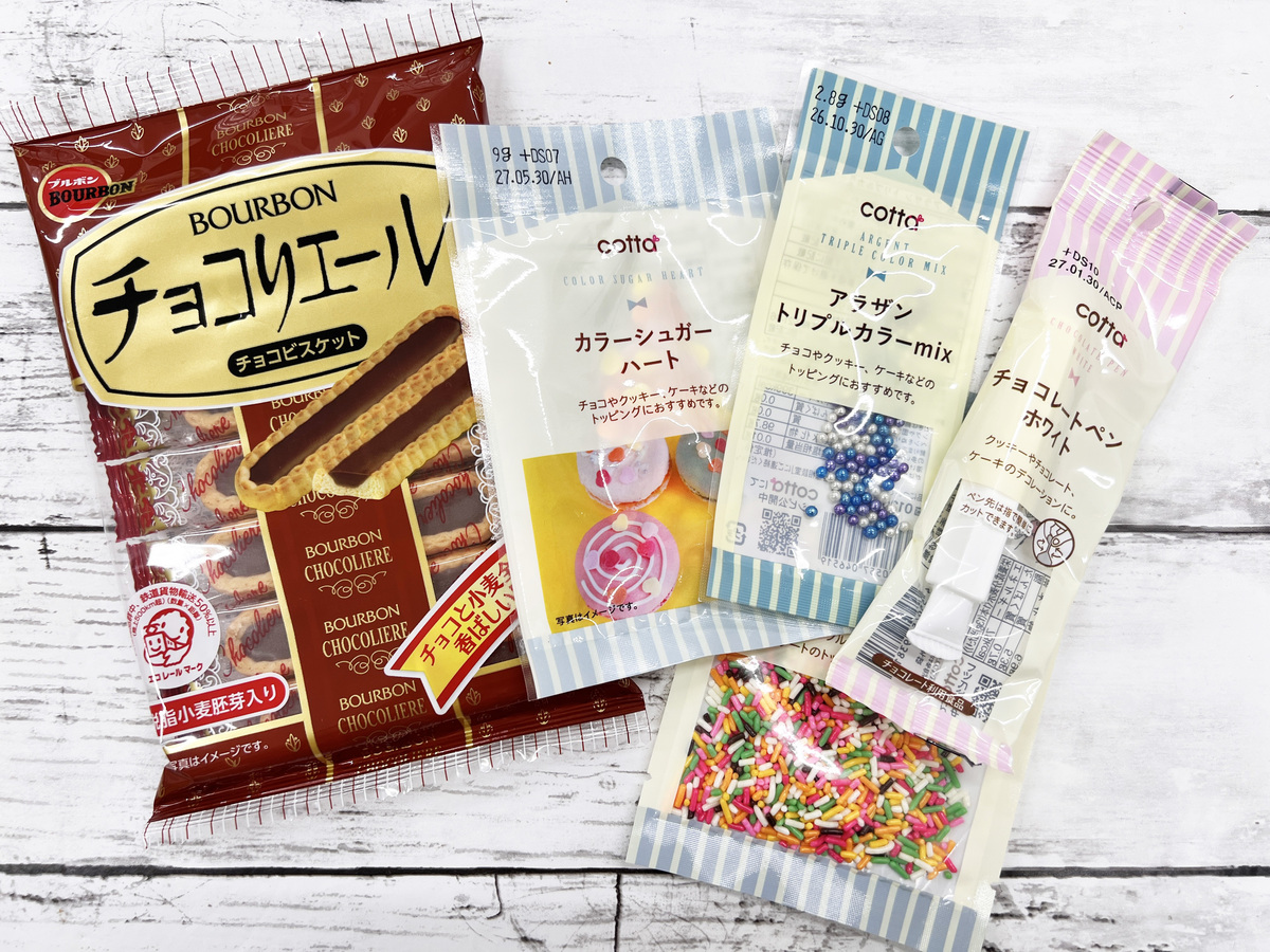 (ここではアラザントリプルカラー/カラーシュガーハート/チョコレートペンホワイト/カラースプレー)