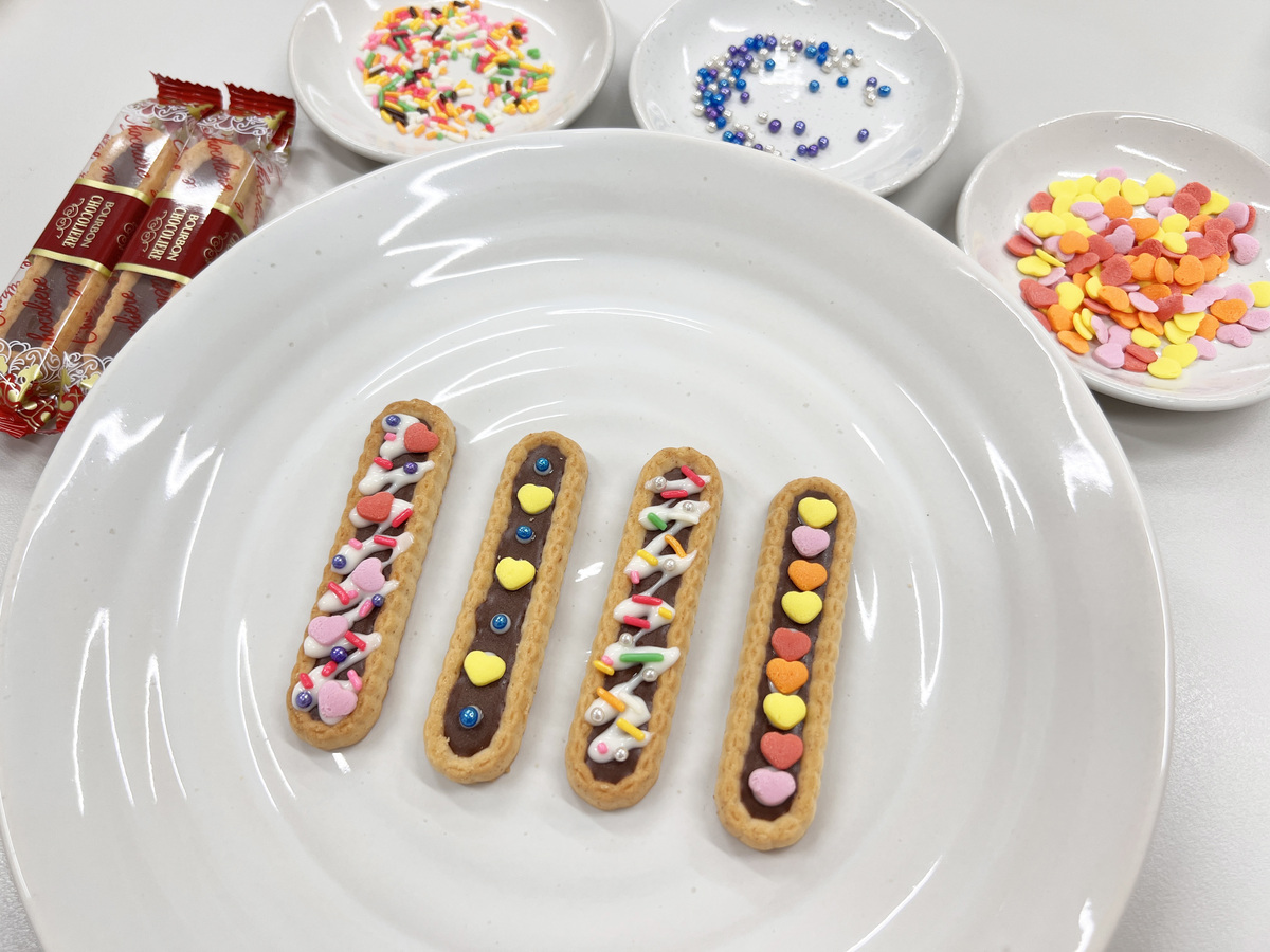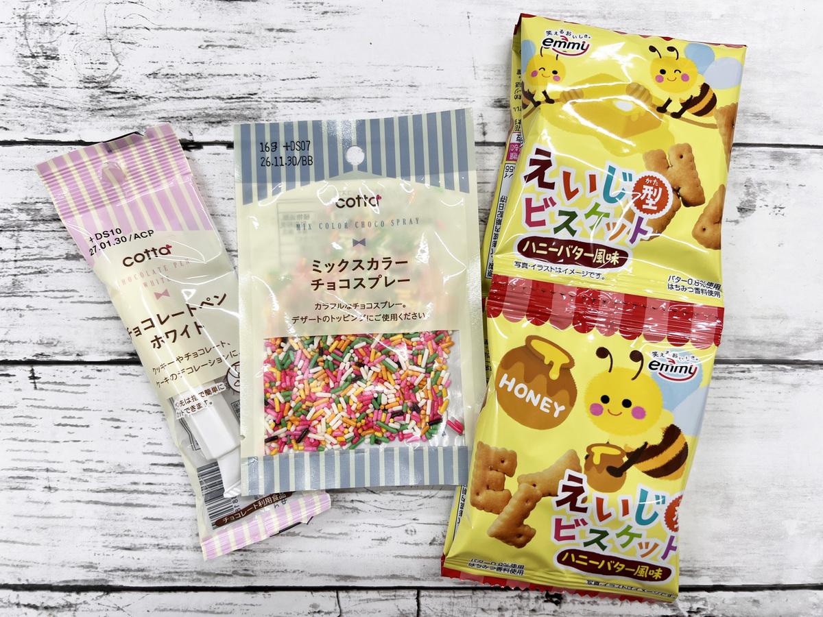 ホワイトチョコレートペンを接着剤代わりにしてお好きなデコレーションをしてください