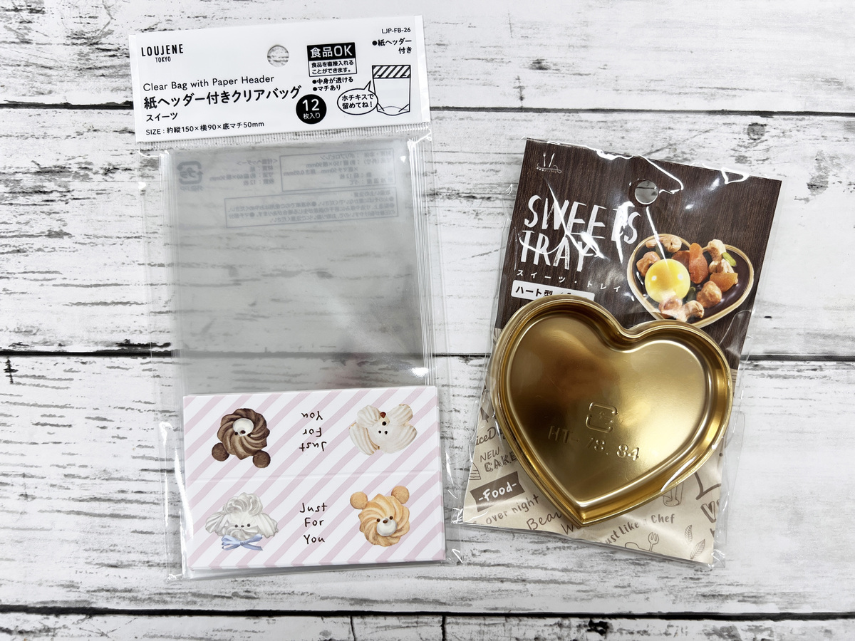 チョコを流し込むハートのケースとラッピングはシSeriaで購入。