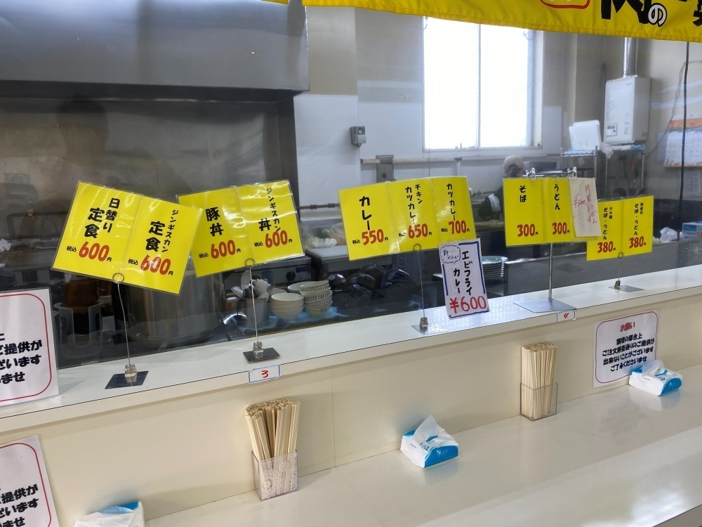 定食や丼物は600円、そばやうどんは300円という驚くような安さです。