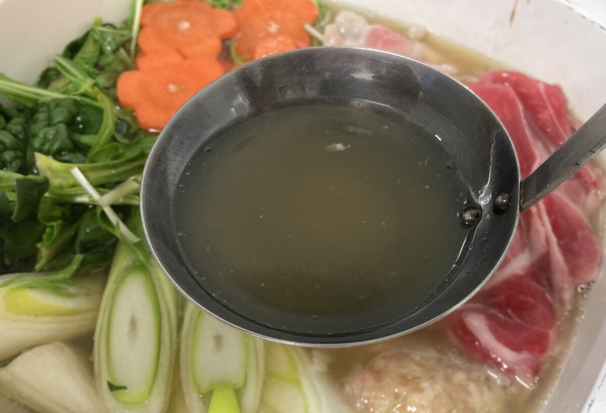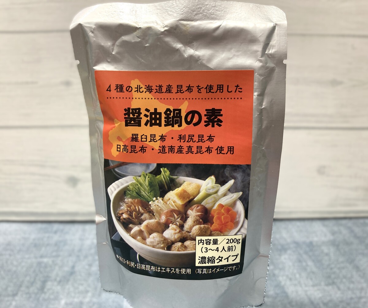 昆布だしがしっかり効いた醤油味の鍋の素で、コンパクトな濃縮液体のパウチタイプなのでおみやげにも便利です。