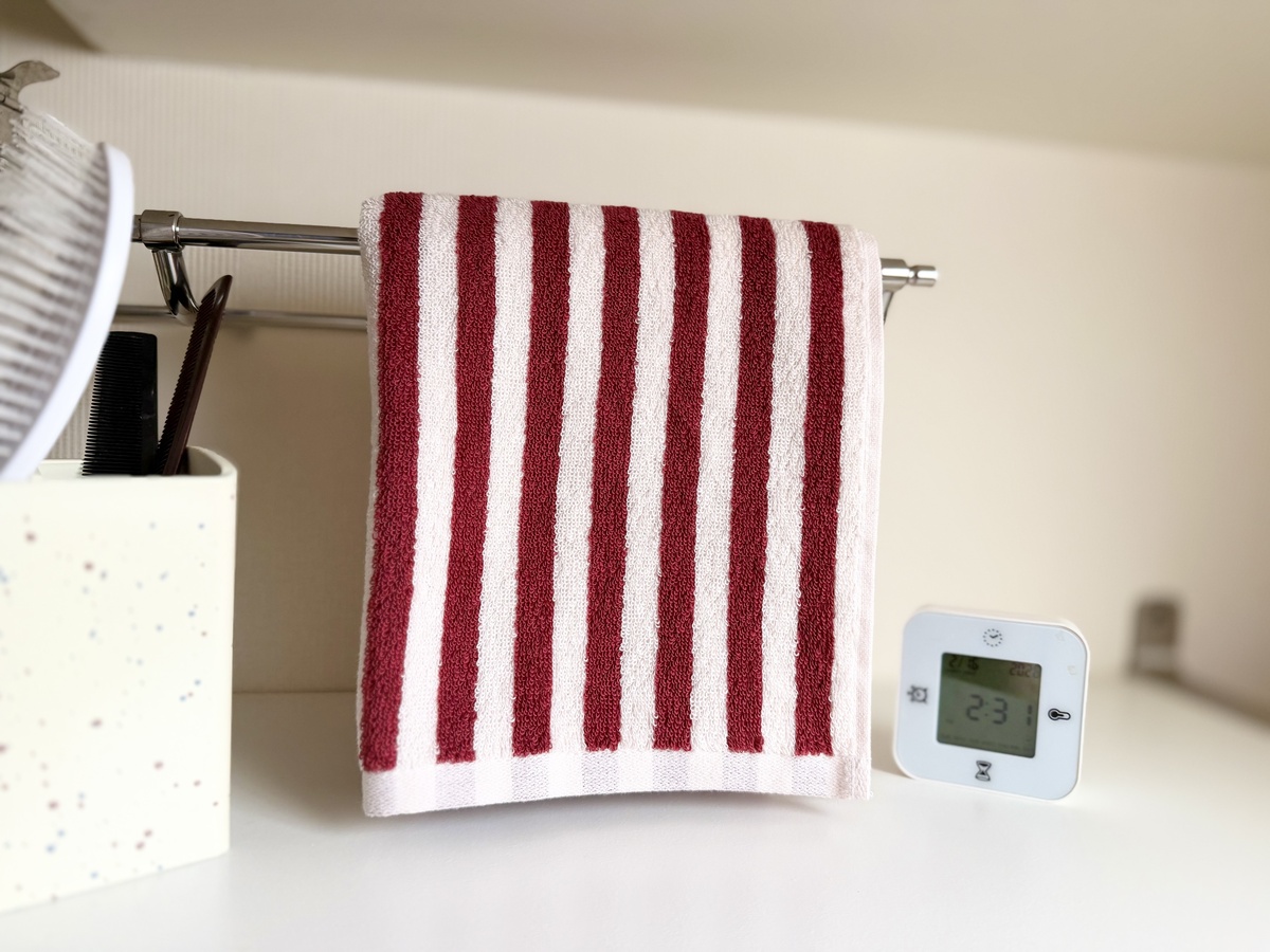 ストライプ柄で、ボルドーよりのレッドの色味がかわいいです。洗面所やキッチンに置くと、インテリアが映えて一気におしゃれな雰囲気に。