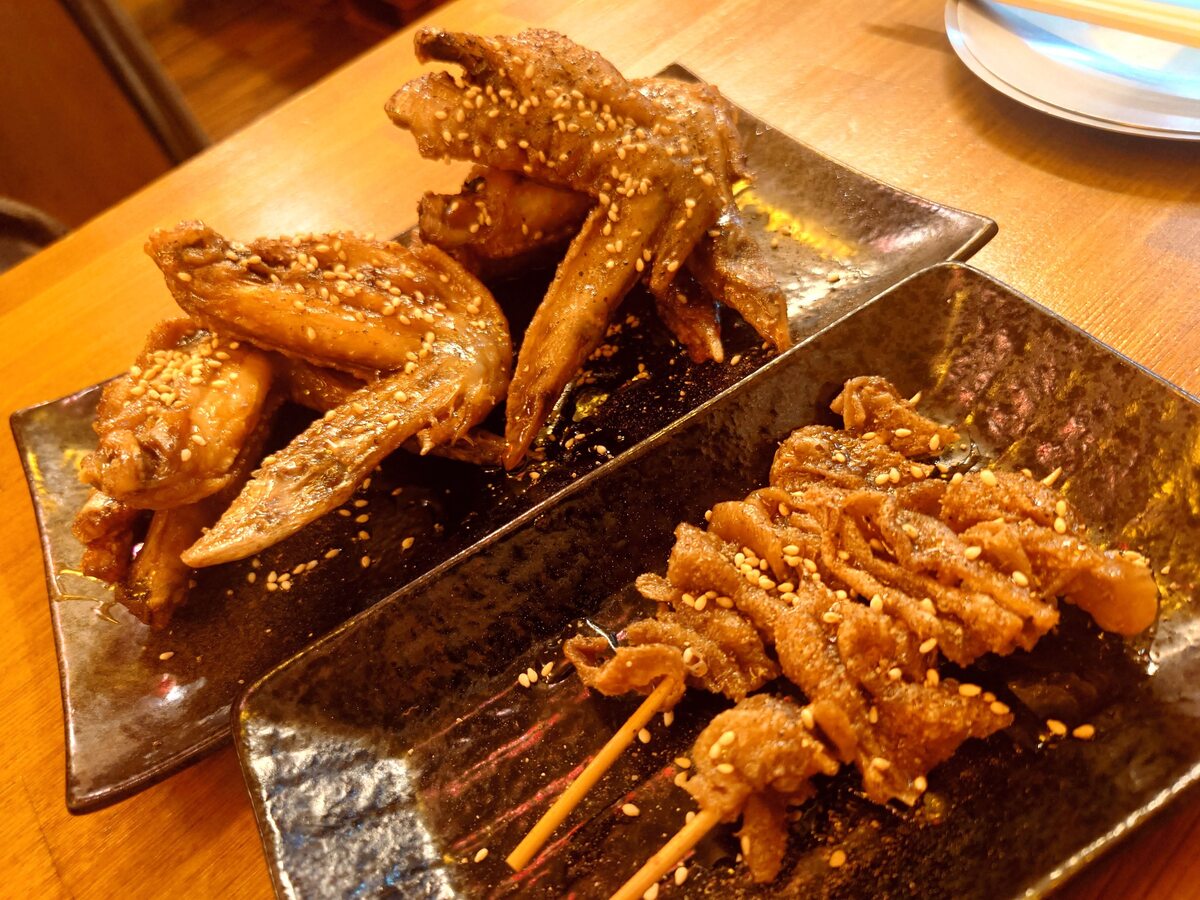 とりごやの金串(1本66円)と手羽先(5本で715円)。撮影:も~ちゃ