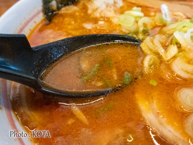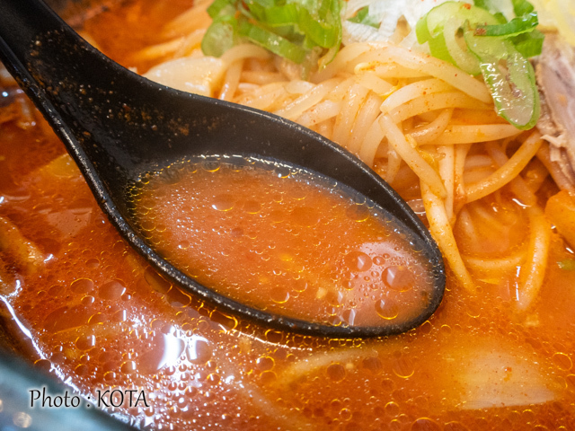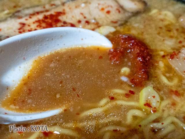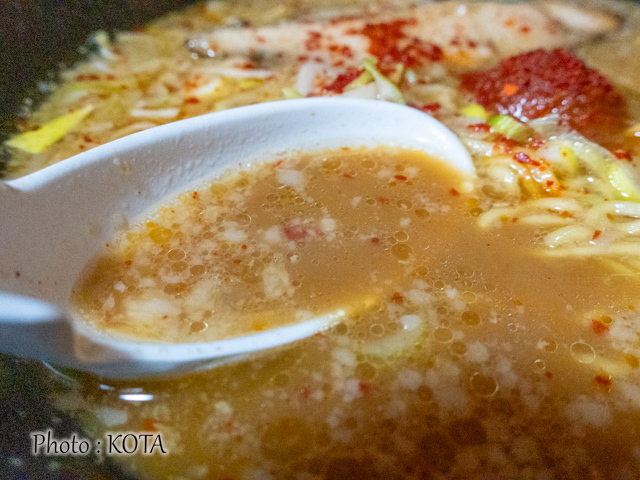 辛玉を回避して、まずは同店本来の味噌ラーメンのおつゆの味を試してみれば、なるほど、野菜や果物20種類以上を組み合わせた出汁と熟成した合わせみそによる(メニューの説明書きより)豊かな味わいが口いっぱいに広がった。