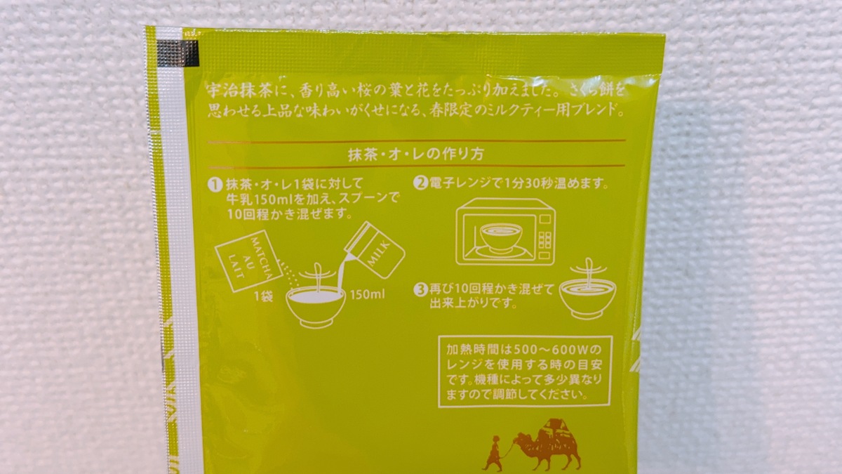 抹茶オレは1袋に対して150mlの牛乳を加え、スプーンでかき混ぜたあと電子レンジでチンするという、とっても簡単な工程で作ることができます。