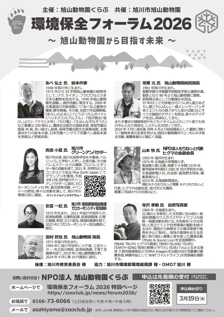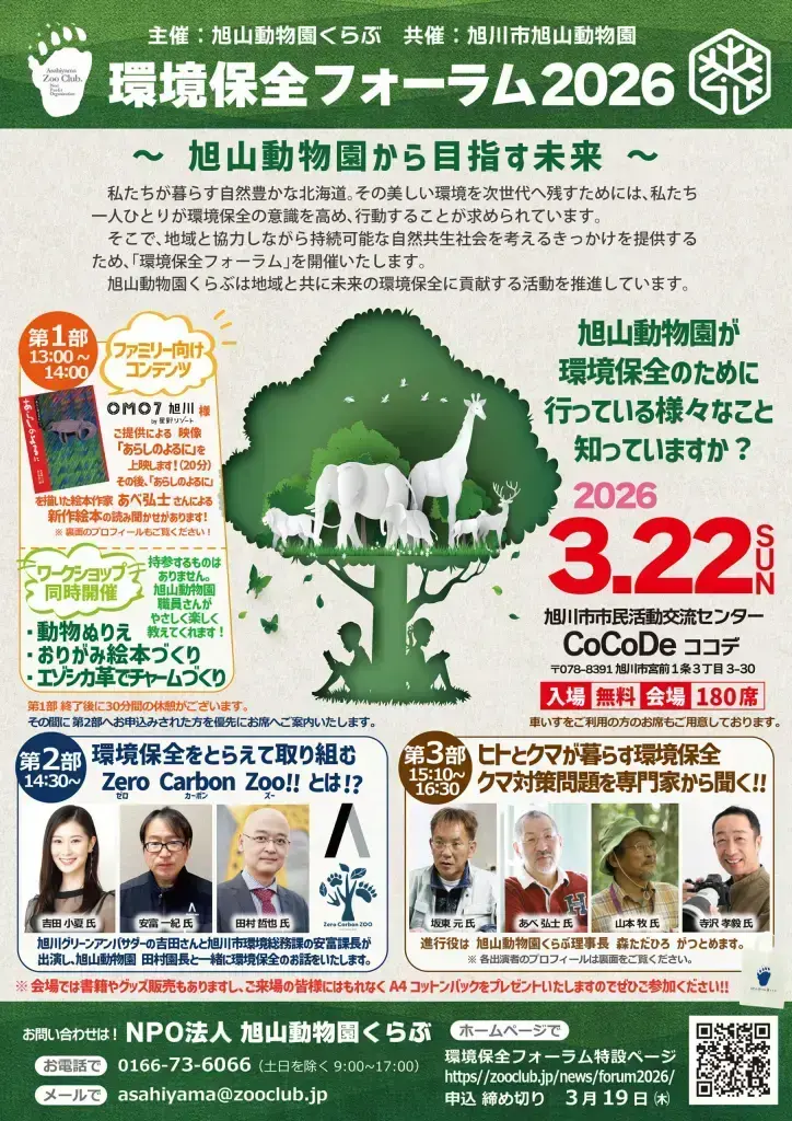 特定非営利活動法人 旭山動物園くらぶは、旭川市旭山動物園との共催により、2026年3月22日(日)に「環境保全フォーラム2026~旭山動物園から目指す未来~」 を開催します。