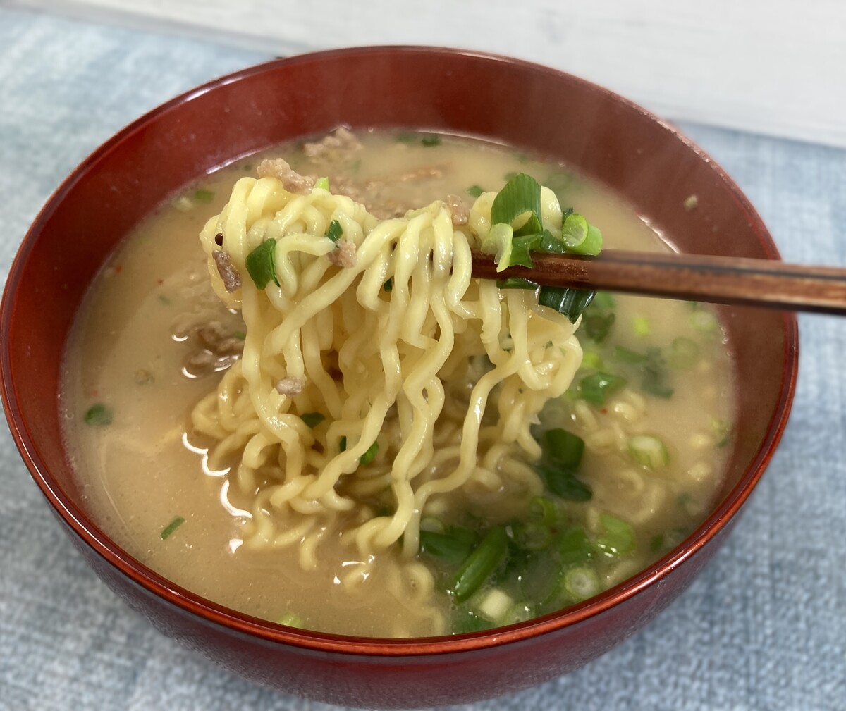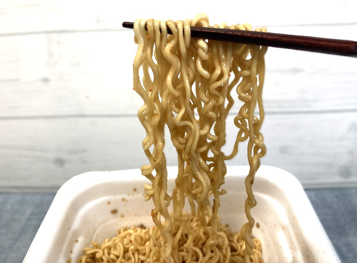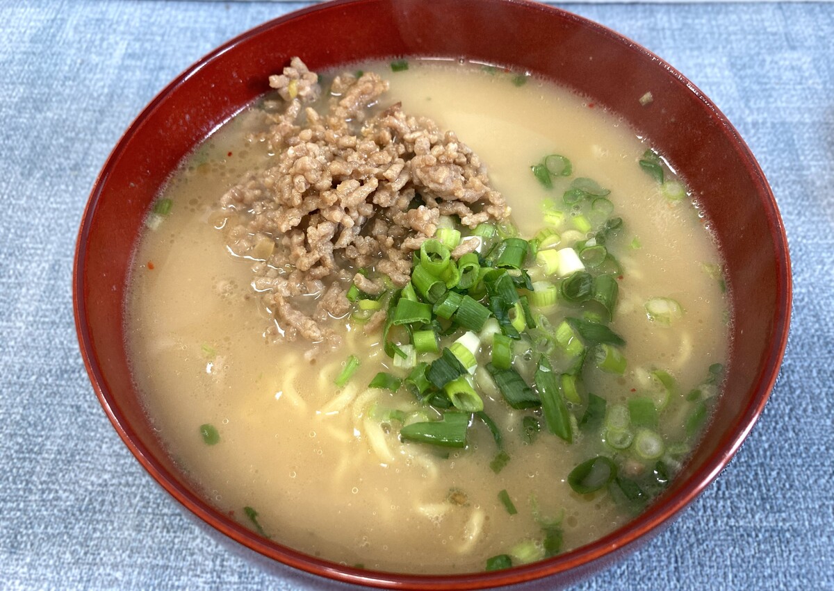 少し太めのちぢれ麺は札幌ラーメンを思わせる食感で、ひき肉やネギをトッピングするとより本格的な味わいに。