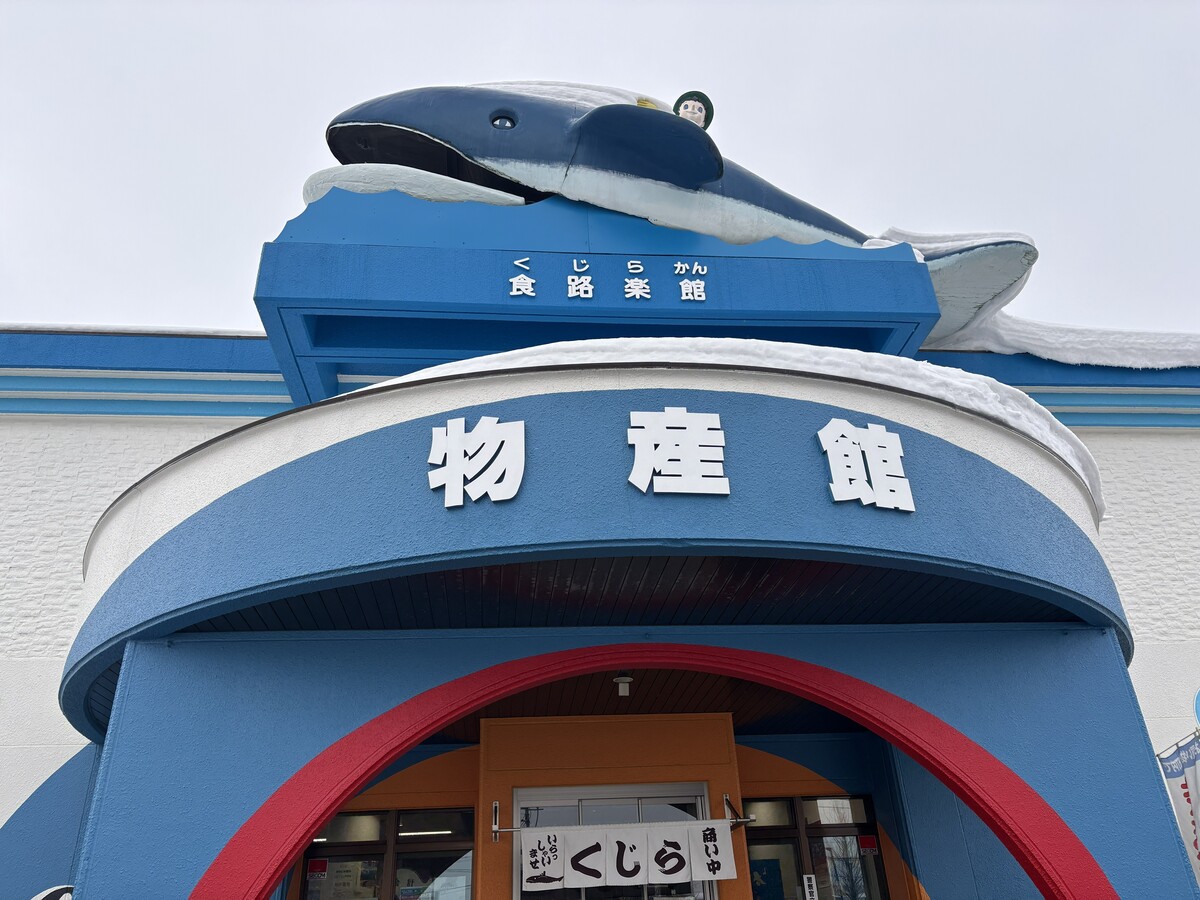 新十津川町の中心にある物産館は、屋根の上の大きなクジラが目印の観光スポット。