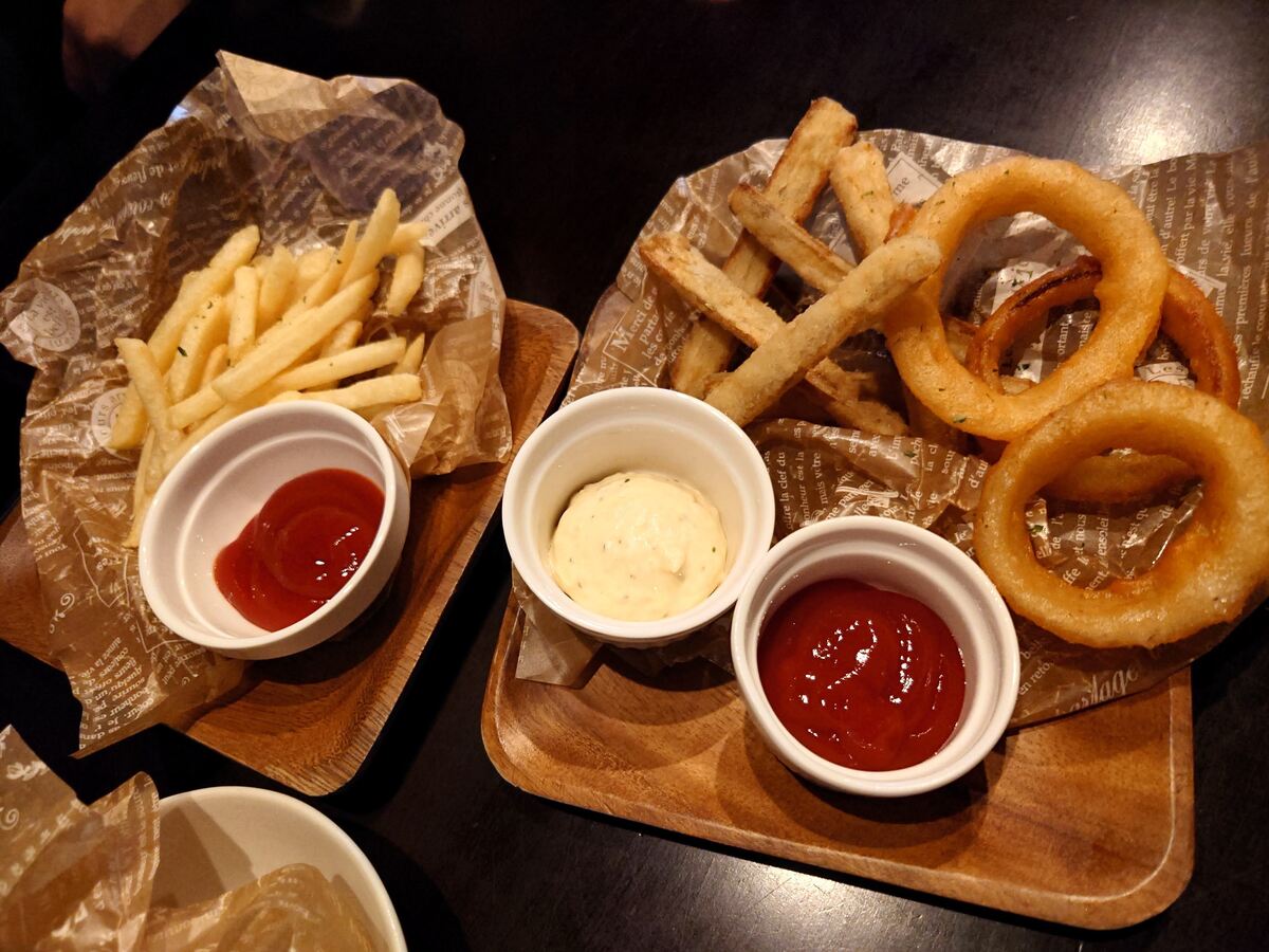 揚げたてのフライドポテトに、サクッと軽いオニオンリング。