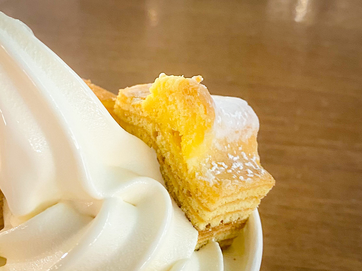 ソフトクリームがミルキーな味わいで、スプーンで掬うとねっと〜りと固めの感触。