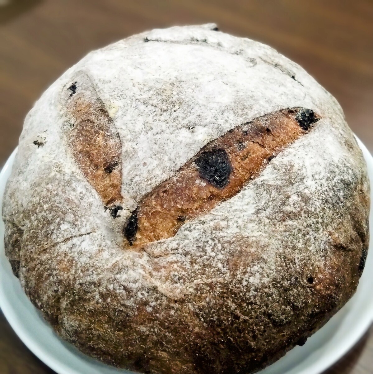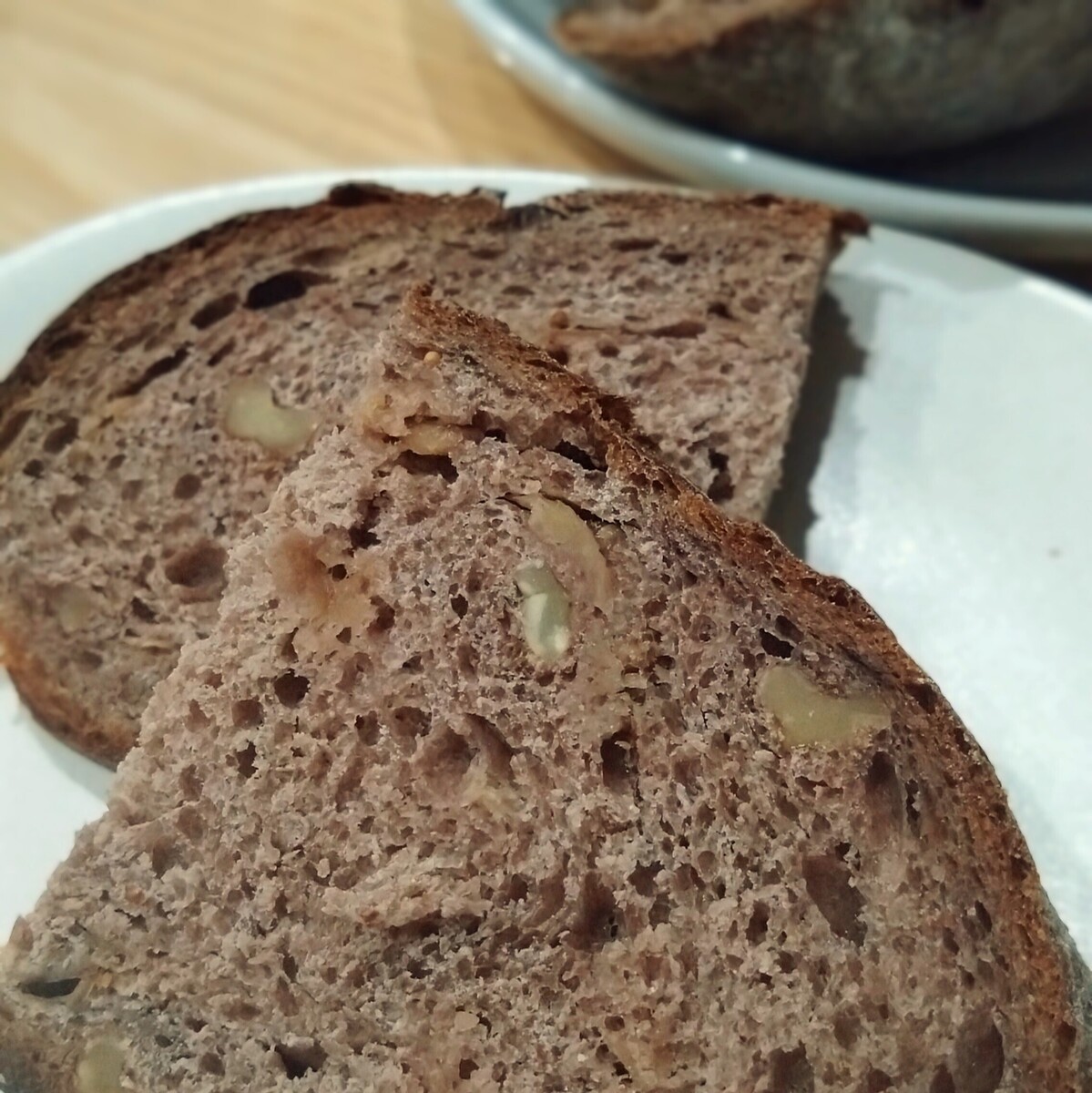 クルミ、イチヂク、レーズンも入っているパン生地の水分の90%が赤ワインだそうで、ポリフェノールたっぷり。