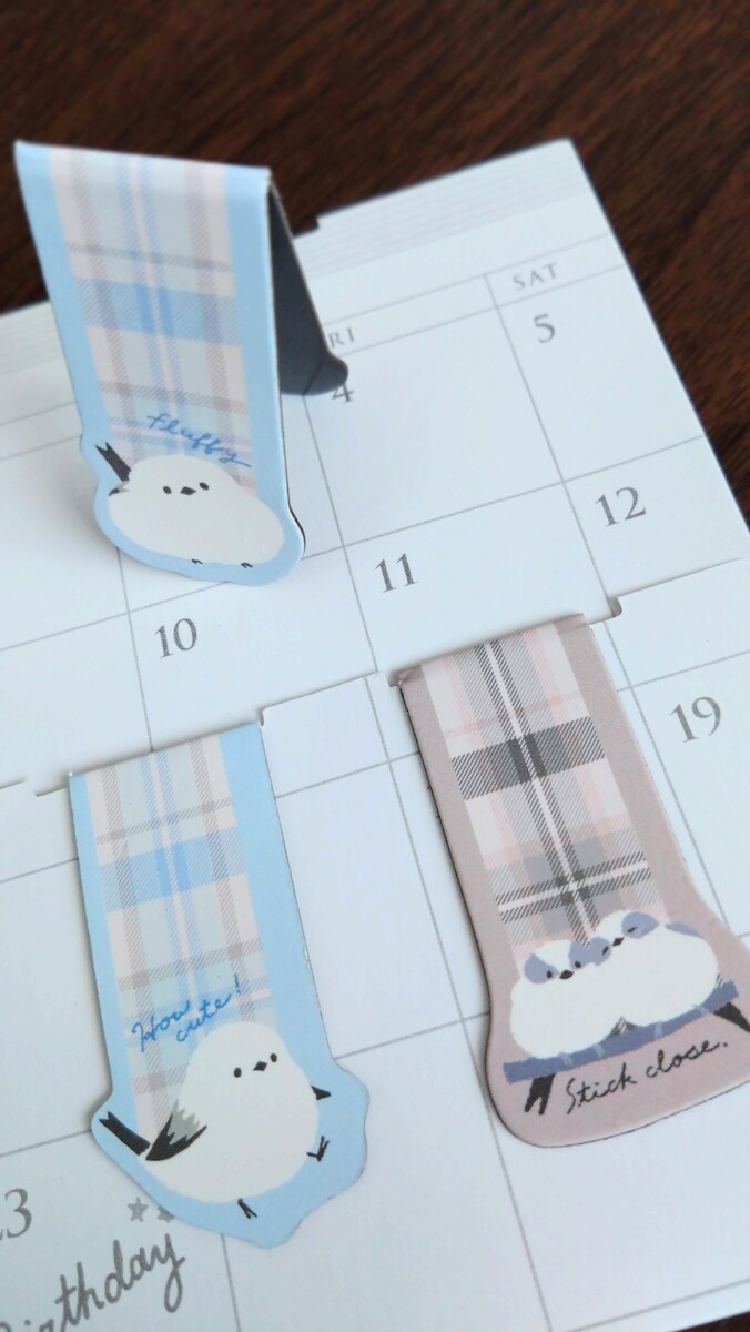 今回はこちらのマグネット式ブックマーカーを購入。シマエナガ幼鳥のイラスト、かわいいが過ぎます。冬仕様のふんわり成鳥のあざとさも良きですが、幼鳥でしか見ることのできないエナガ的配色もたまりません。