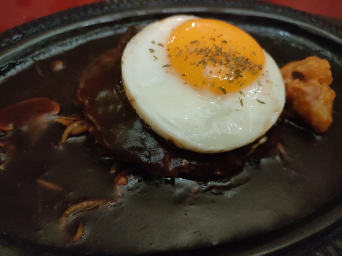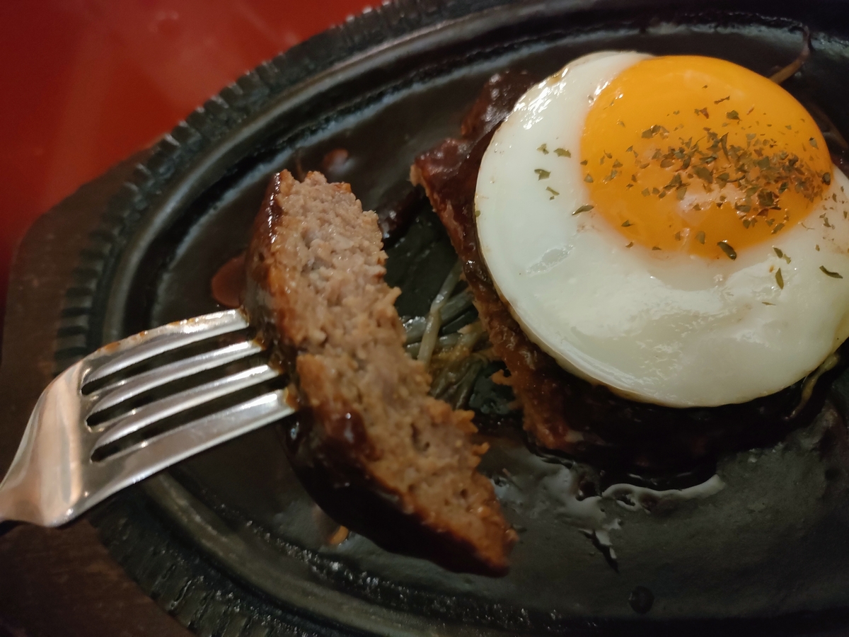 ハンバーグ自体はふんわり系ではなく、しっかりとした食感が楽しめるタイプで、一口食べると肉汁がジュワッと広がり、噛む程に旨みが増していく感じ。