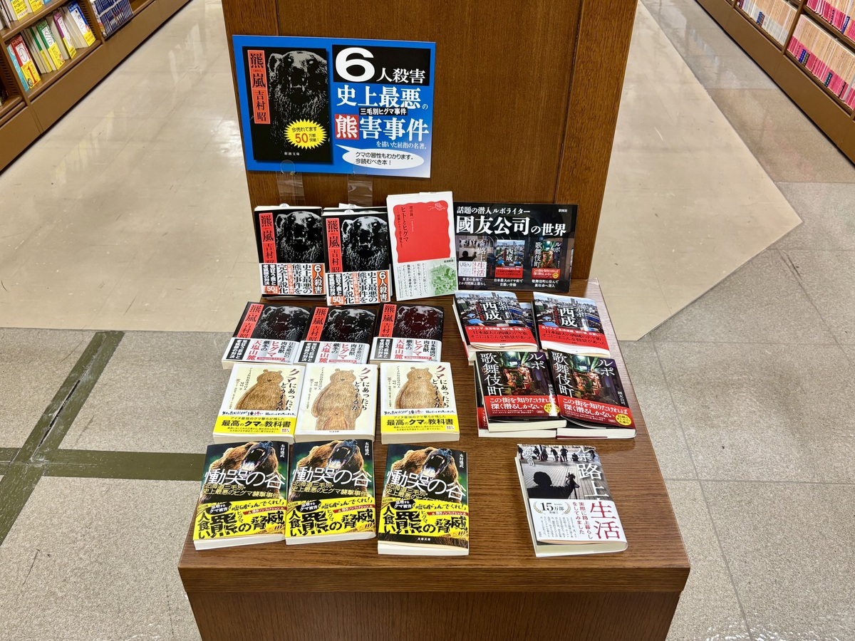 かねてよりフィール旭川5階の「ジュンク堂書店 旭川店」では、熊(とくにヒグマ)に関連する書籍が数冊、平積みされているのを見かけていました。