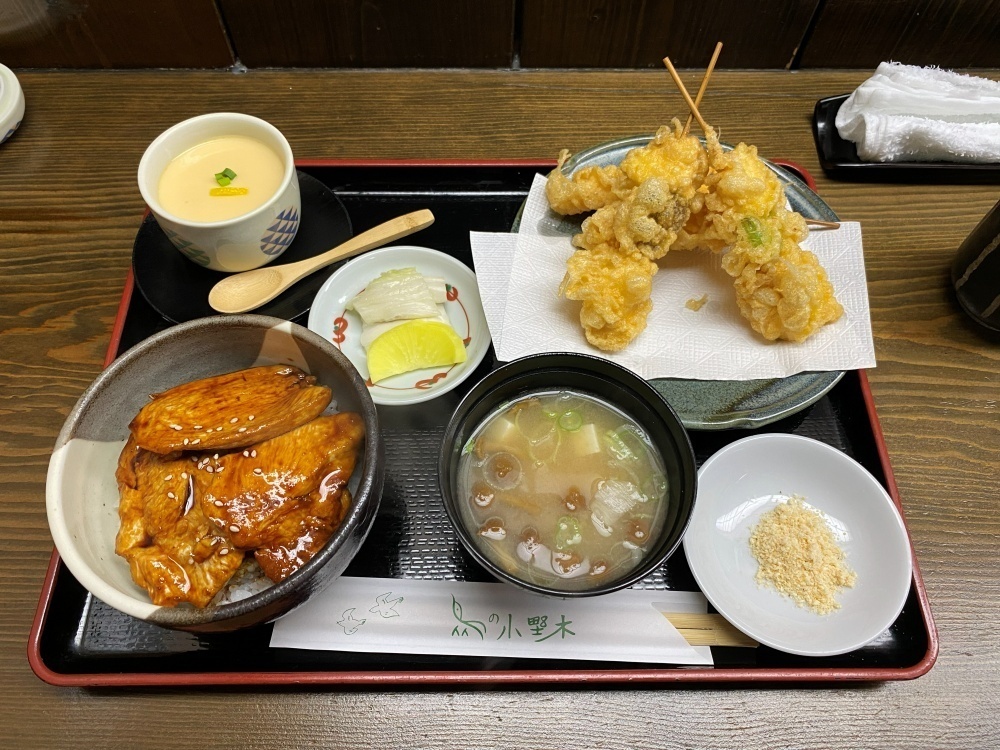 鳥丼は、タレをからめて焼いた鳥肉がごはんの上にのっています。甘めのタレがごはんによく合いますね。串揚げは、鳥肉に椎茸やピーマン、玉ねぎといった野菜を挟んで揚げていました。