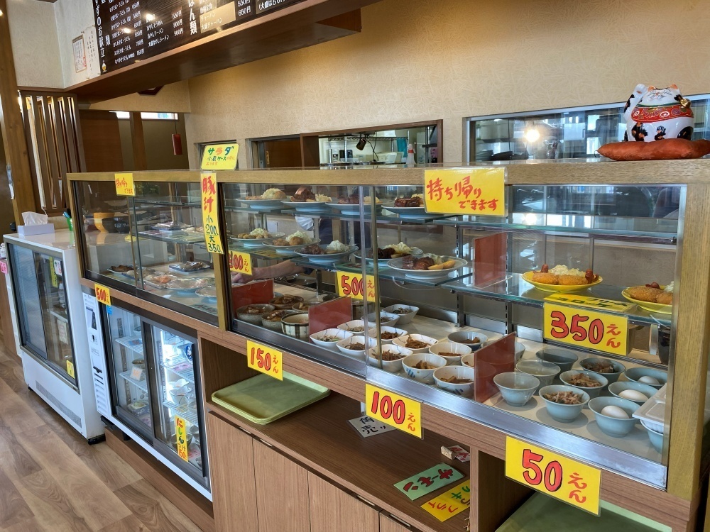 お品書きには11種類の定食やカレーライス、チャーハン、丼ものといったご飯類、そばやうどんなどの麺類など豊富なメニューが並んでいますが、ショーケースに並んだ1品料理の中から好きなものを選んで、オリジナルの定食を作ることもできます。