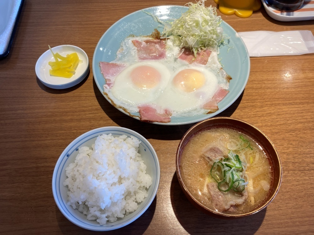 この日、筆者が選んだのは「ベーコンエッグ 500円」+「ごはん(小)150円」+「とん汁(小)200円」です。