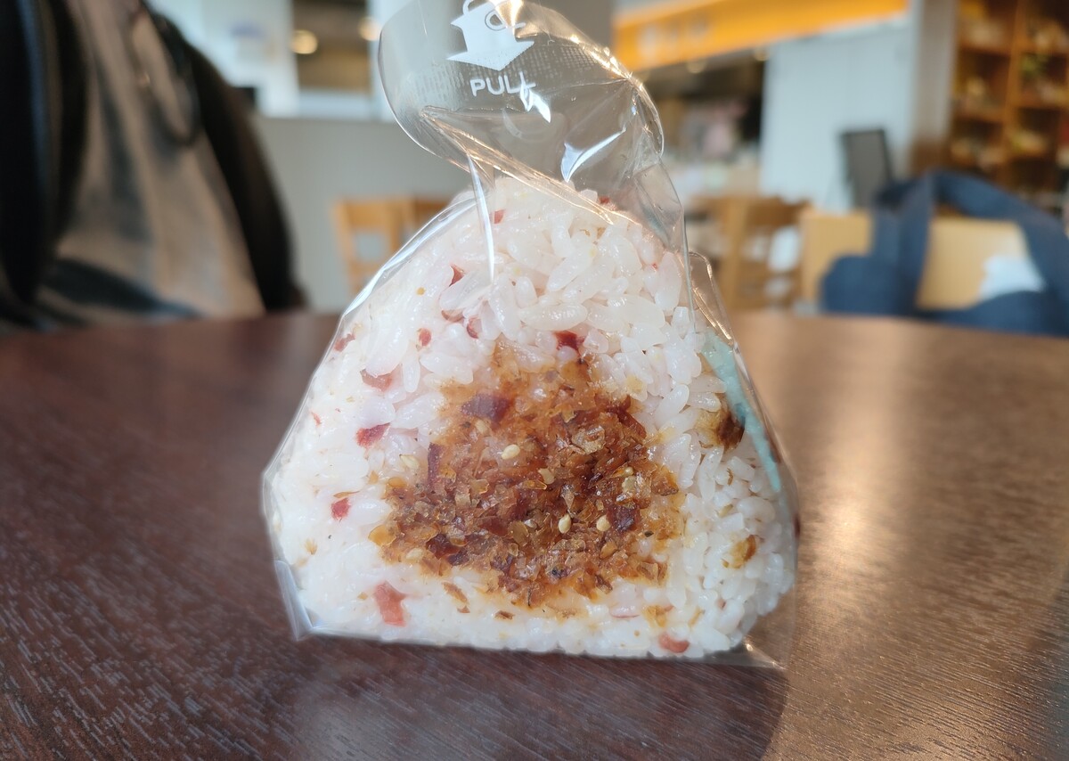 フラノマルシェ2に入っているおむすびのお店で、ショーケースに並ぶ数々のおむすびの中から迷ってチョイスした梅おかか。