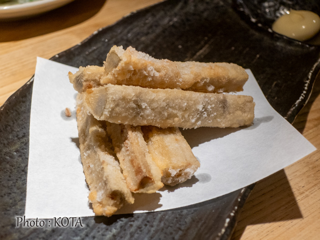 (画像上から)燻製とチーズの意外な組み合わせ、不思議な味わいがクセになる「クリームチーズいぶりガッコ山わさび」(495円)は今でも人気の定番メニュー。ホクホク食感のごぼうから揚げ「ごぼう棒」(495円)、フレッシュなジャガイモの食感が面白いじゃが明太(440円)も、安定の美味しさだ。