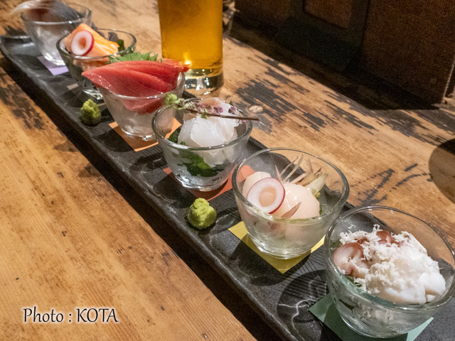 いわゆる「おまかせ刺身」だが、この日はサバ・サーモン・マグロ、白身、ホタテ、タコというラインナップ。