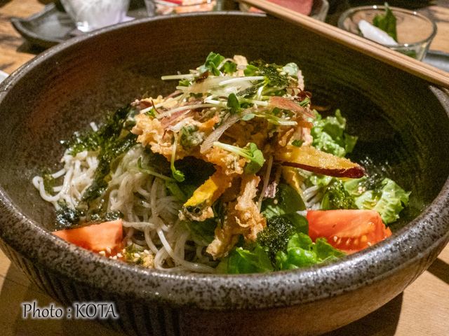また酒が進んでしまう(笑)という人気メニュー「旅篭風胡麻そばとかき揚げのサラダ」(1,078円)。