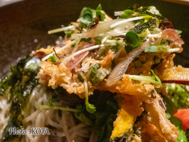 それはともあれ、ドレッシングと和そばの相性ばつぐん。加えて、かき揚げの香ばしさが加わったハイカラ(?)な食べ応えに魅了されること間違いなし。