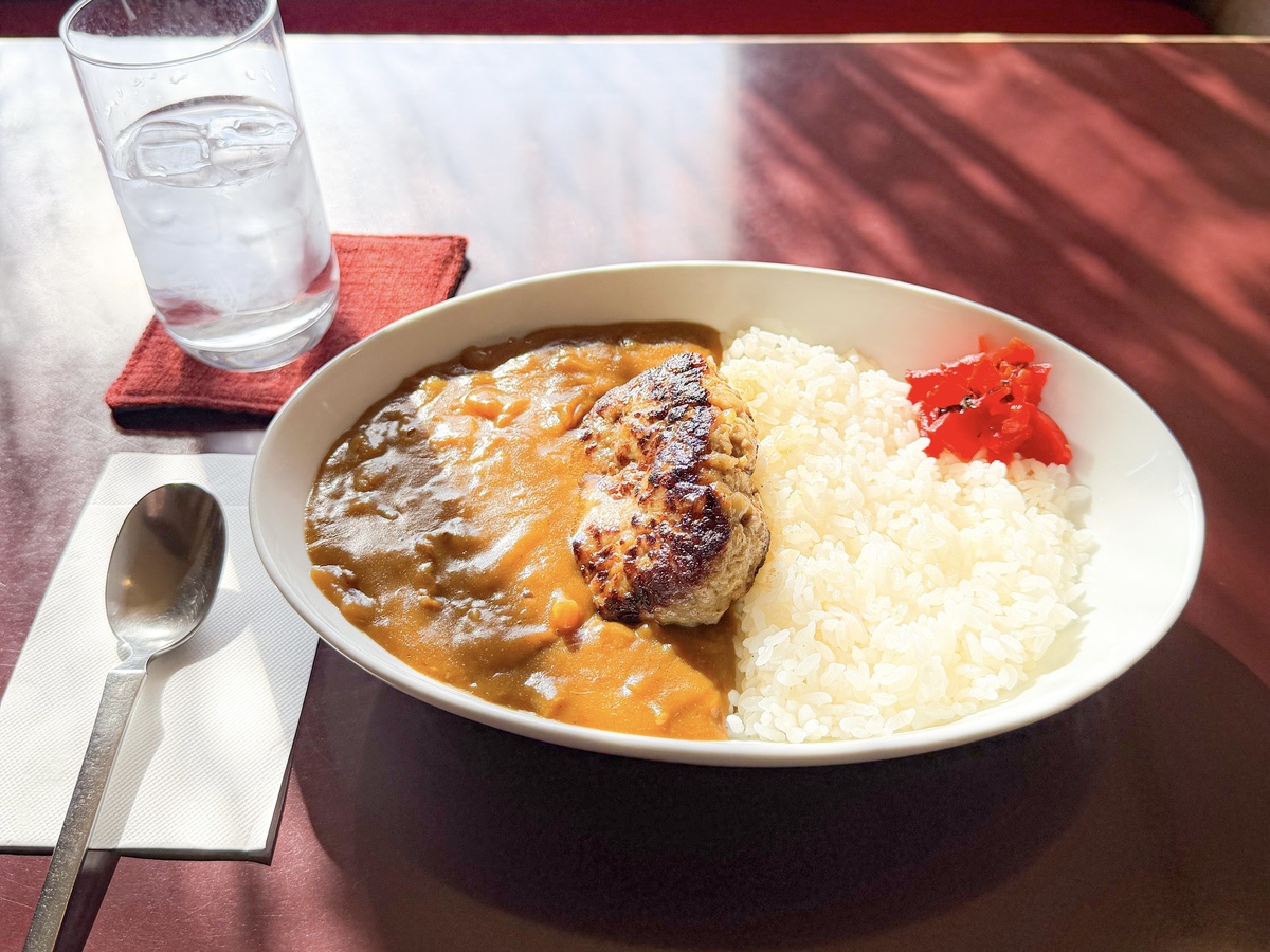香ばしさが感じられるハンバーグがジューシー。この肉汁とカレーが混ざり合うのがまた美味しい。