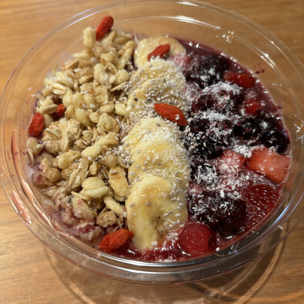 サクサクのグラノーラ、たっぷりの甘酸っぱいベリー、バナナ、トッピングはチアシードかヘンプパウダーが選ぶことができ、栄養価抜群のチアシードにしました。