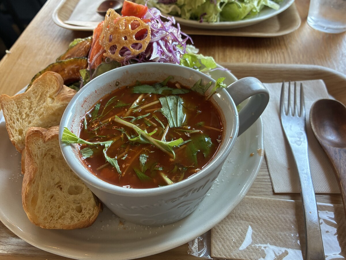 自家製のトマトソースを使った程よい酸味と野菜の甘さが溶け合って、体がほっとする味わいのスープ。