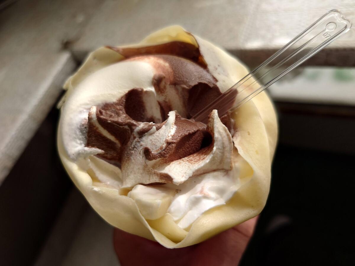 あたたかいクレープに冷たいソフト、この組み合わせがなんだか楽しい(笑)。