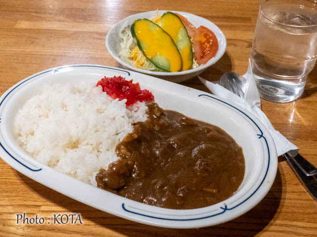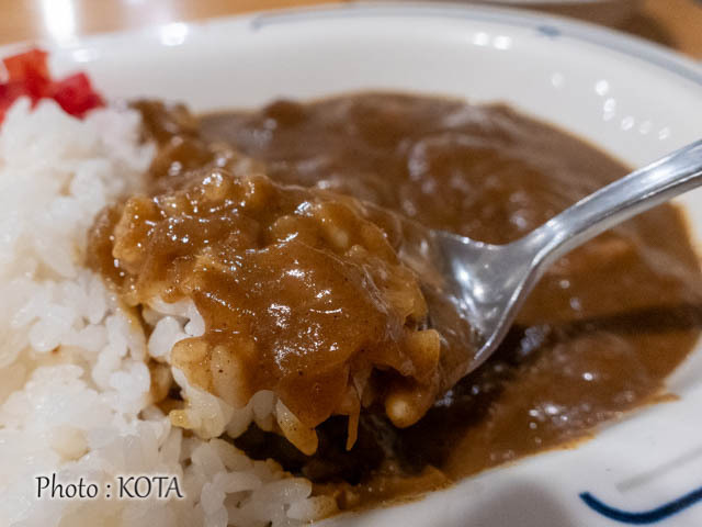 ルウはなかなかの濃いめ仕立て。食べ進むうち、じわじわと辛味が口にしみてくる。