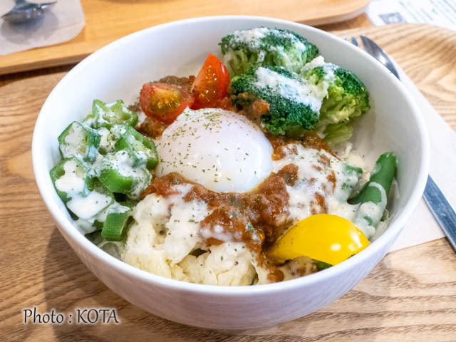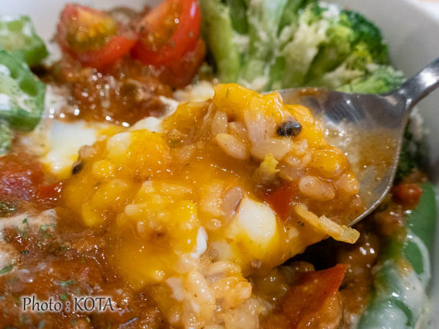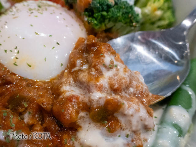 サラダの説明はさておき、肝心のキーマであるが、挽肉の旨みに溶け込んだトマトがきゅっと香る、フレッシュな仕上がり。だからサラダごはんとも相性がよく、食べるほどに食欲が増す思い。