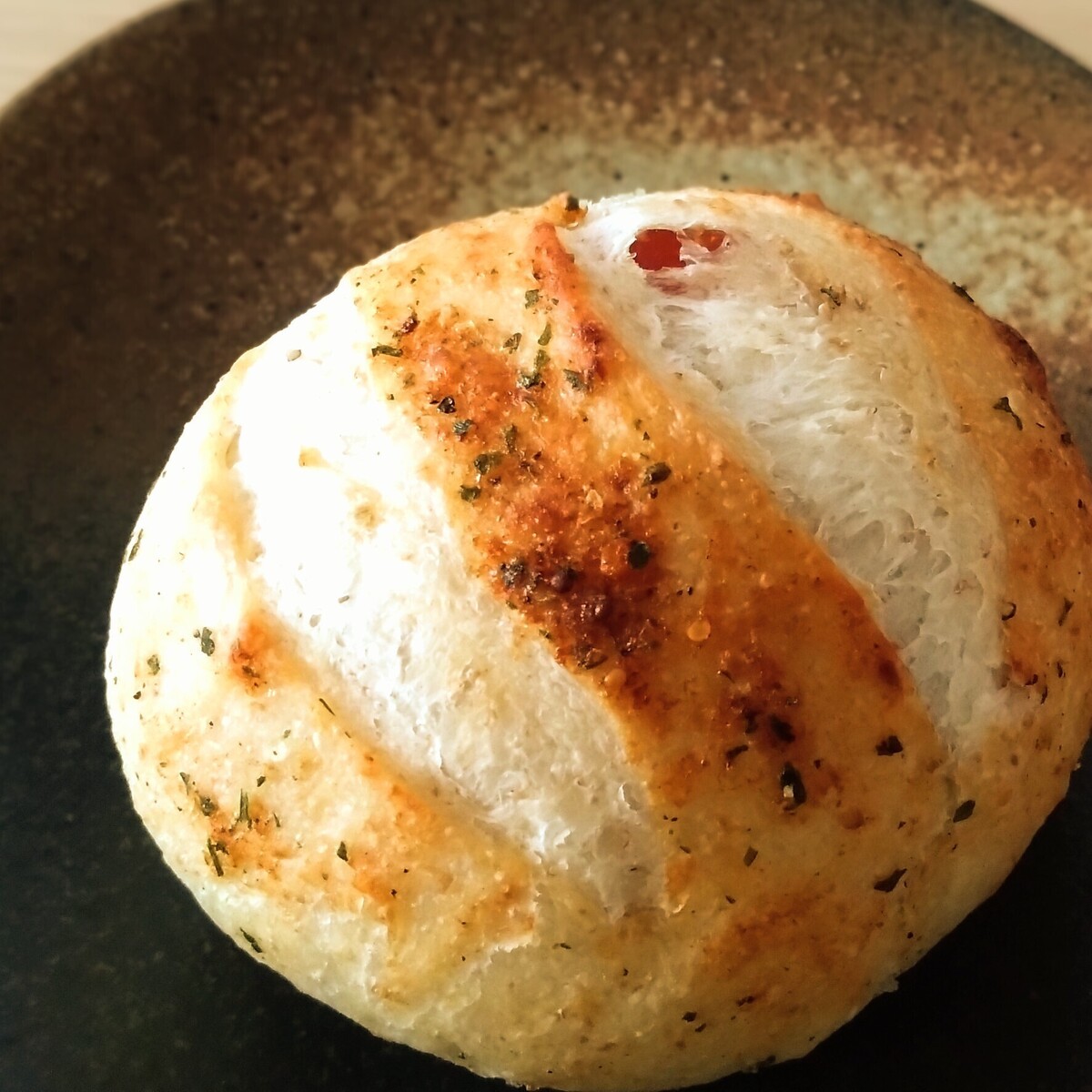 中にはドライトマトがふんだんに練り込まれていて、濃厚な甘みと食感が楽しい。パンの表面に薄く塗られたガーリックバターの風味と塩味がドライトマトとマリアージュ。ああ、口の中がイタリアン。