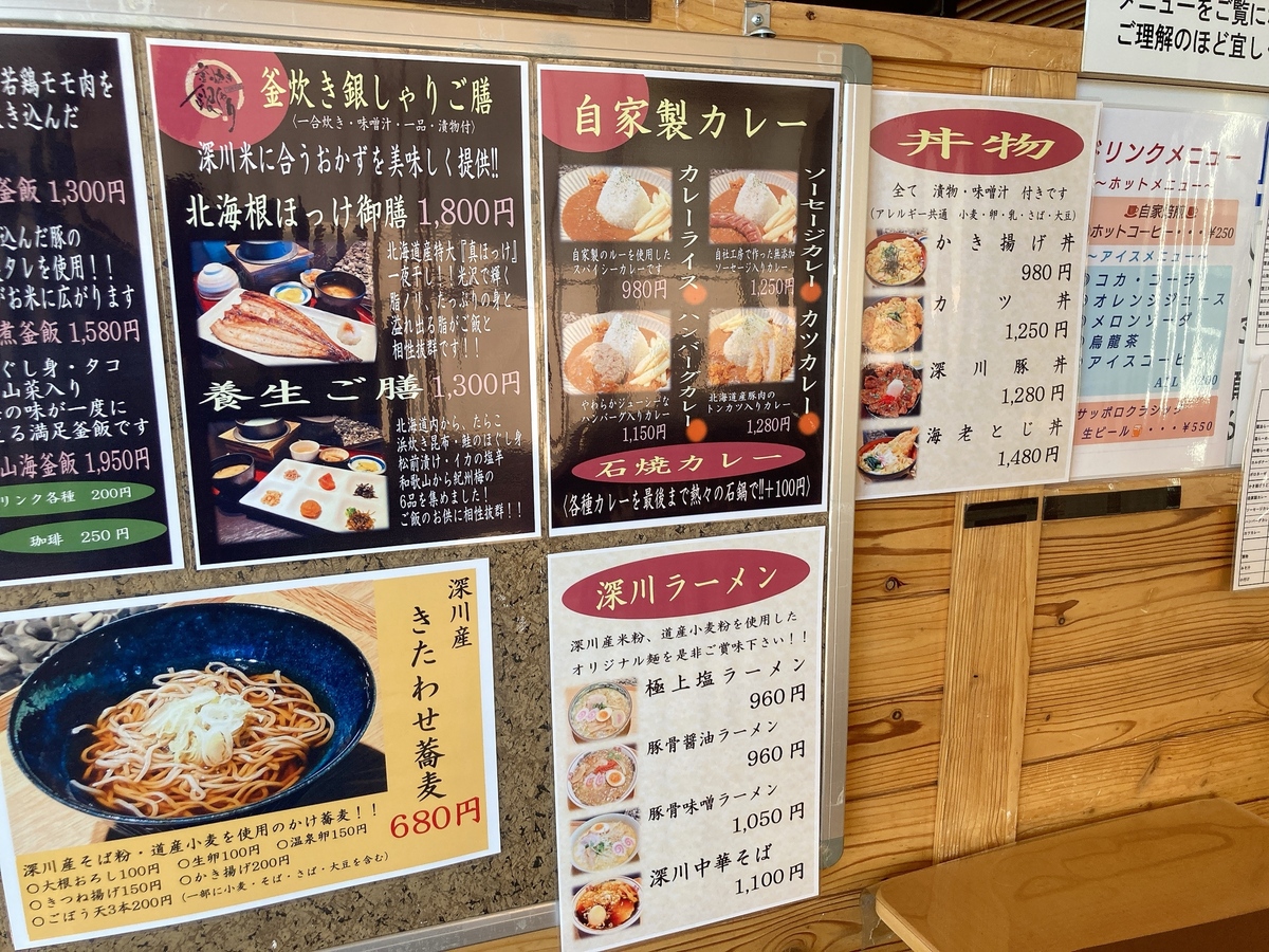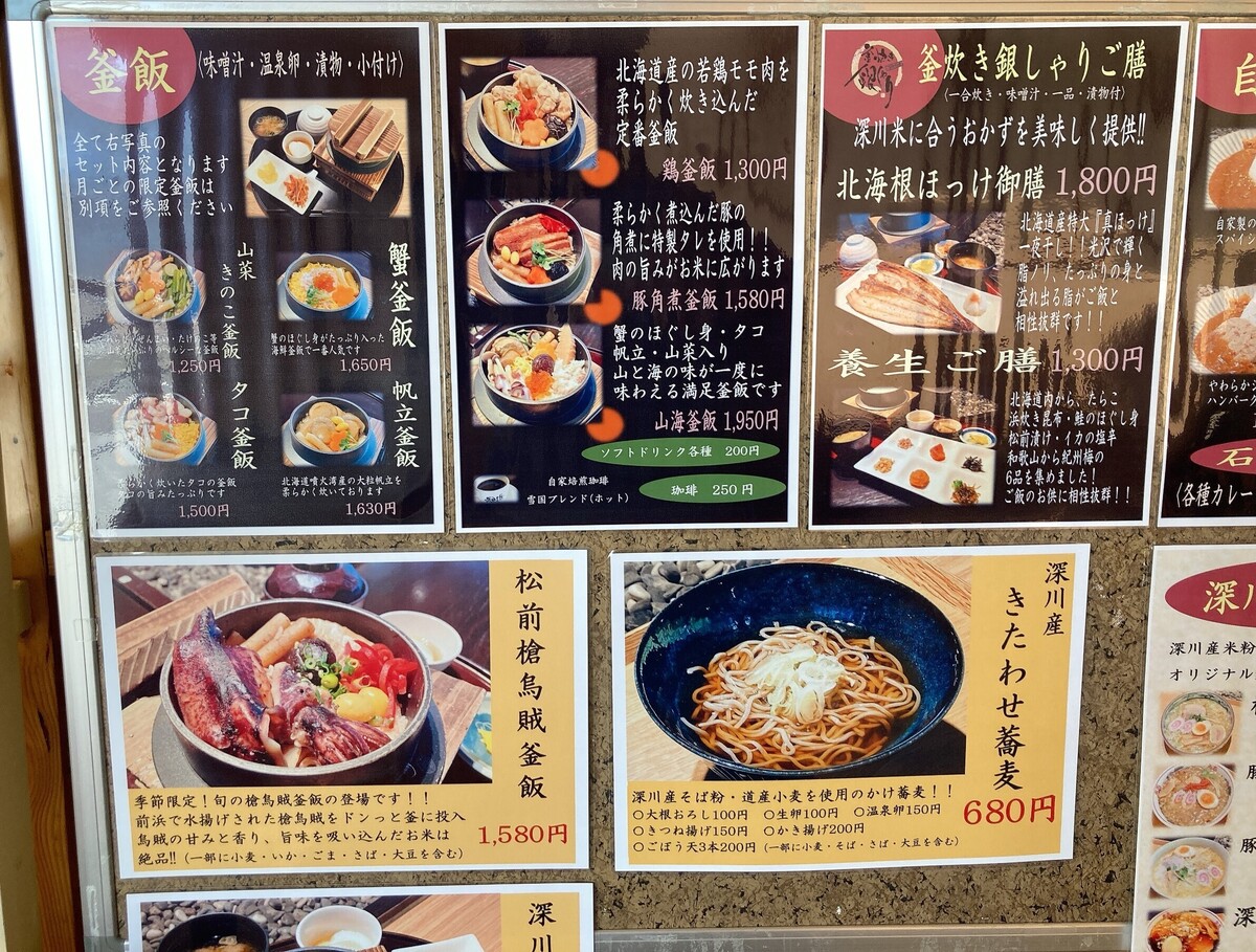 メニューは、深川産のお米を使った釜飯をメインに、かつ丼などの丼ものや、深川産の蕎麦粉を使ったおそば、米粉や道産小麦を使ったラーメンなどもあり、地産地消な内容が魅力です。
