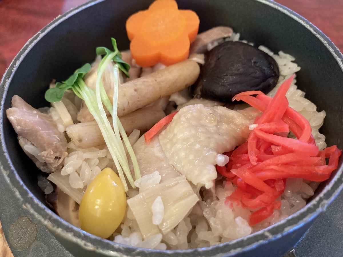ぎんなん、にんじん、椎茸、ごぼうなど具だくさんで、椎茸を噛むとジューシーなお出汁があふれます。大きな鶏肉もゴロゴロ入っていて食べ応え◎。