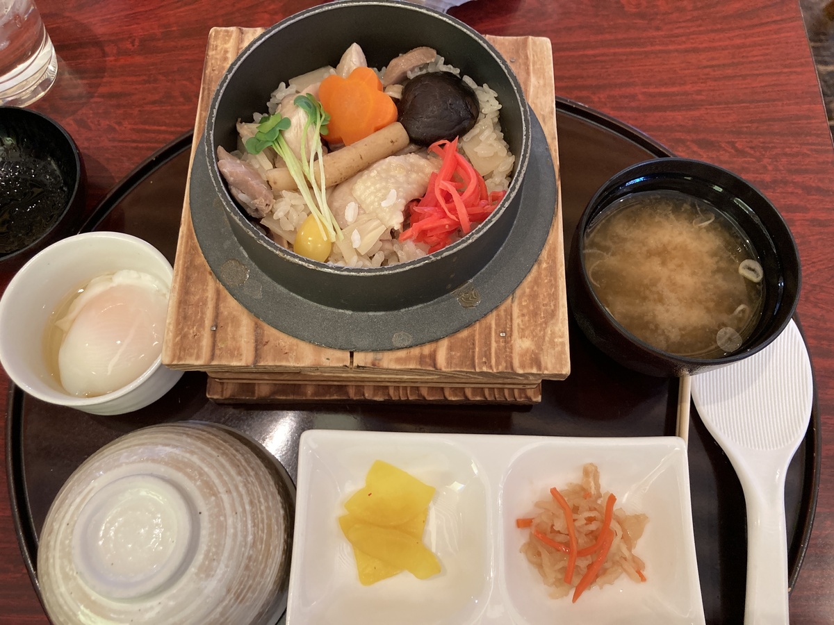 鶏釜飯1300円(税込)は、お味噌汁に温泉卵、切り干し大根の煮物とお漬物付き。もちろんお米は深川産。