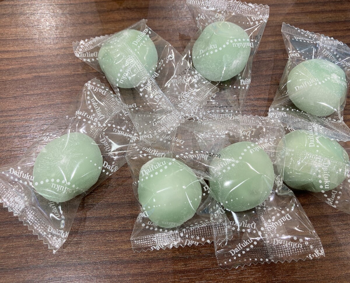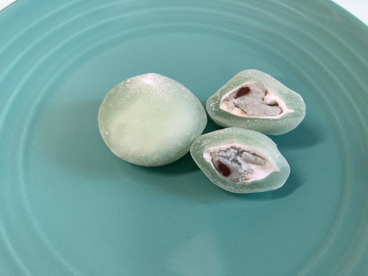 中はマシュマロ+ミント味ホワイトチョコ+チョコチップ。外側はほんのり透け感のあるミントカラーのおもちで包まれています。
