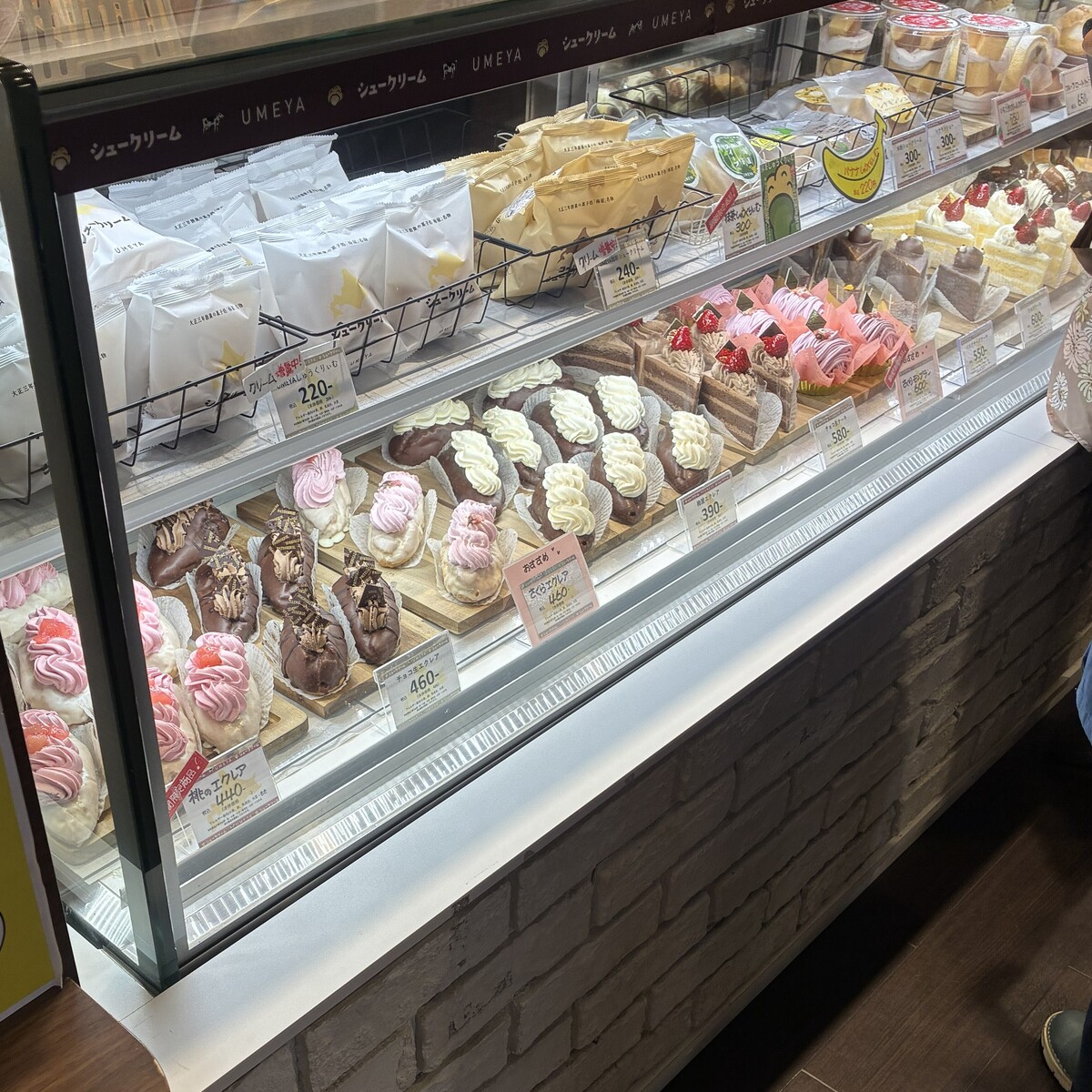 ショーケースにはシュークリーム、エクレア、ケーキがずらり。