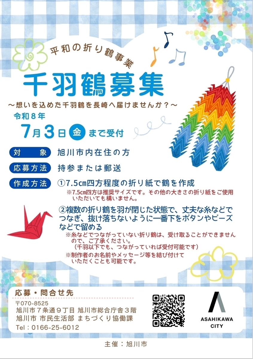 旭川市が、平和都市宣言推進事業の一環として、市民の方々からの千羽鶴を募集しています。