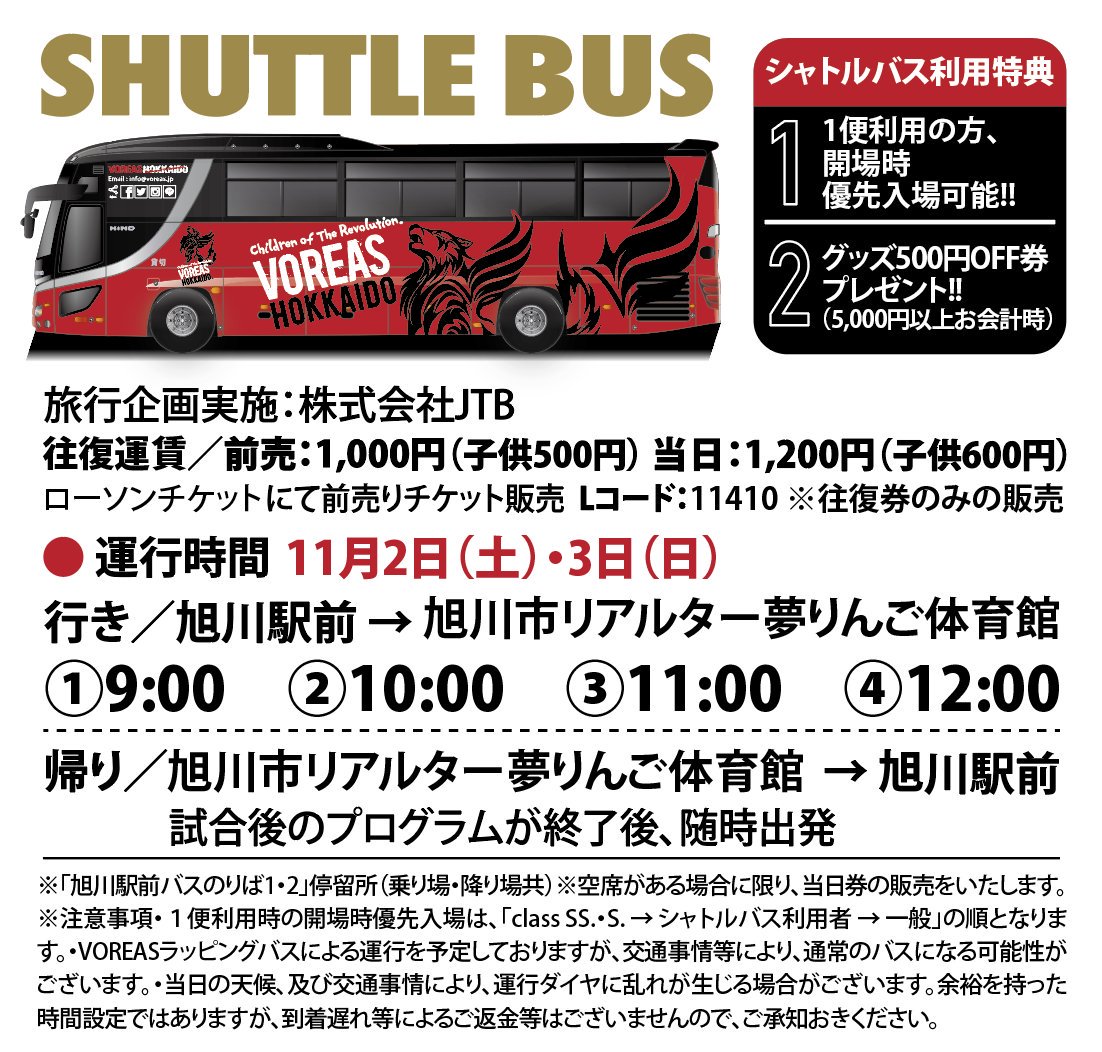 「市外から行くから、会場までのバス調べなきゃな…」なんて人もいると思います。でも安心してください~!試合会場によりますが、今回の開幕戦と次回1月のホームゲームでは、旭川駅と会場を往復するシャトルバスが運行されるんです。
