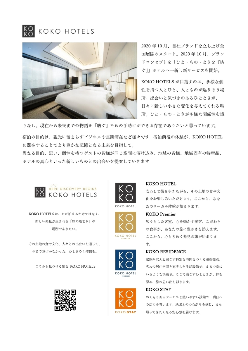 「ホテルウィング」「テンザホテル」「KOKO HOTELS」の3ブランドを統合し、国内有数の展開数を誇るホテルブランド『KOKO HOTELS』として新たにスタートする運びとなりました。