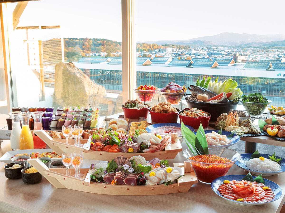 大好評の自分で作る海鮮丼をはじめ、旭川しょうゆ焼きそばや新子焼き、120年以上の歴史を誇る高砂酒造さんとコラボしたフェアメニューなど種類豊富な和洋ビュッフェをご用意しております。